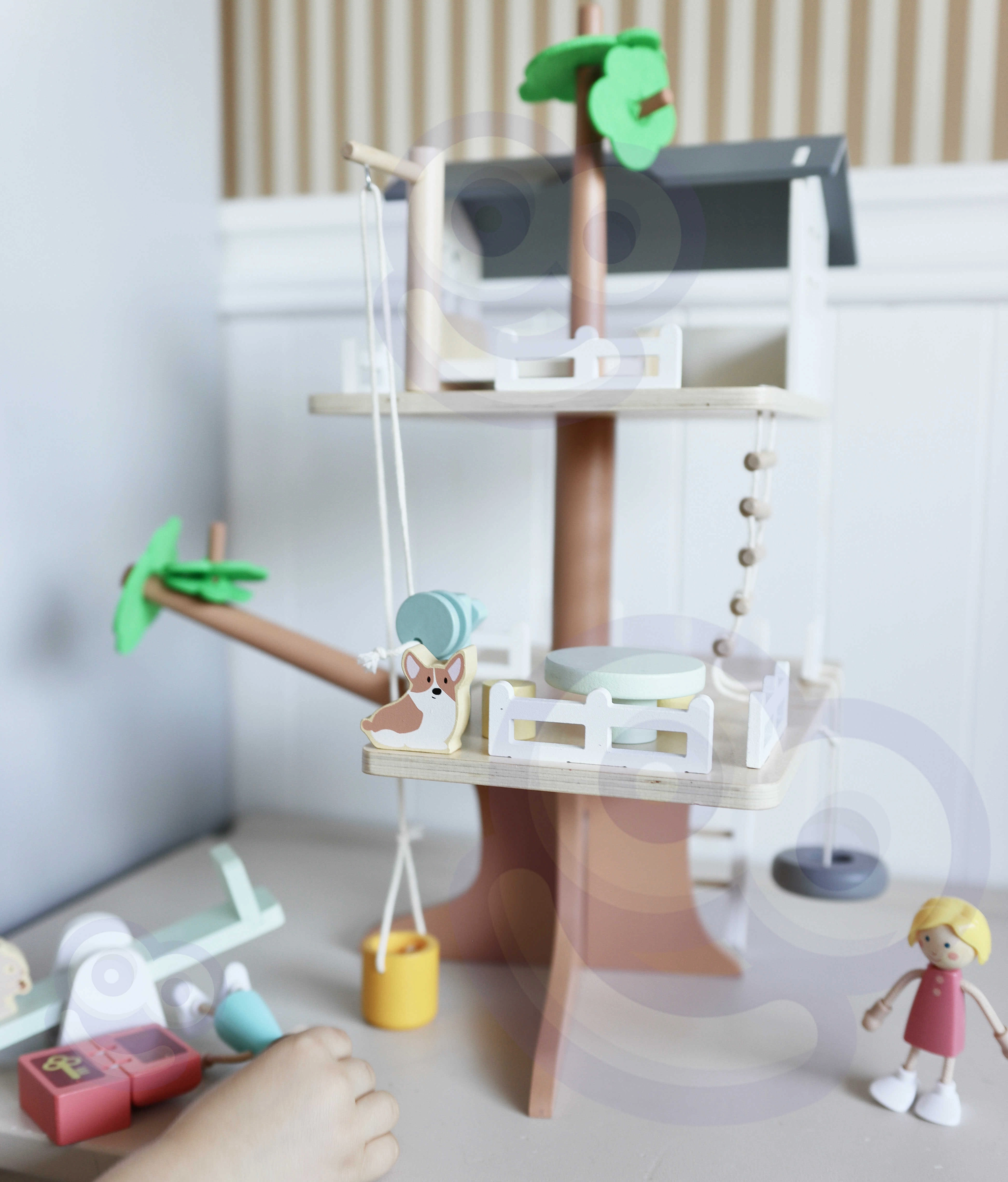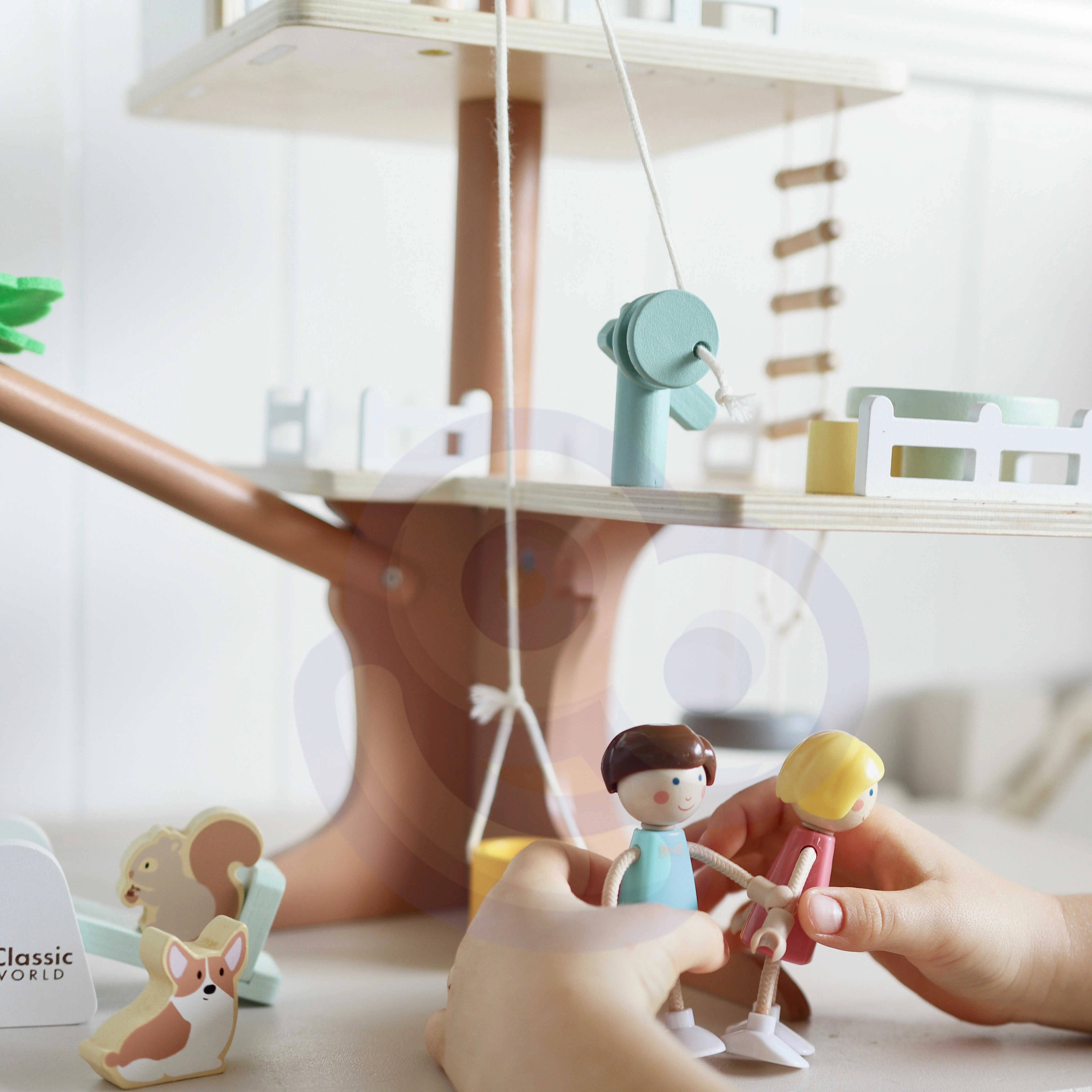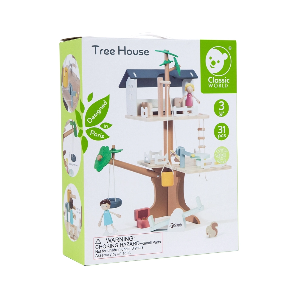Къщата на дърво Classic World кани децата в свят на фантазия и истории. Двуетажната конструкция с огради, стълба и малка къщичка предлага много сценарии – от вдигане на съкровища с подвижния макара с кофа до люлеене на люлките и игра с животинките. Комплектът е идеален за развитие на фината моторика, креативността и социалните умения при съвместна игра.