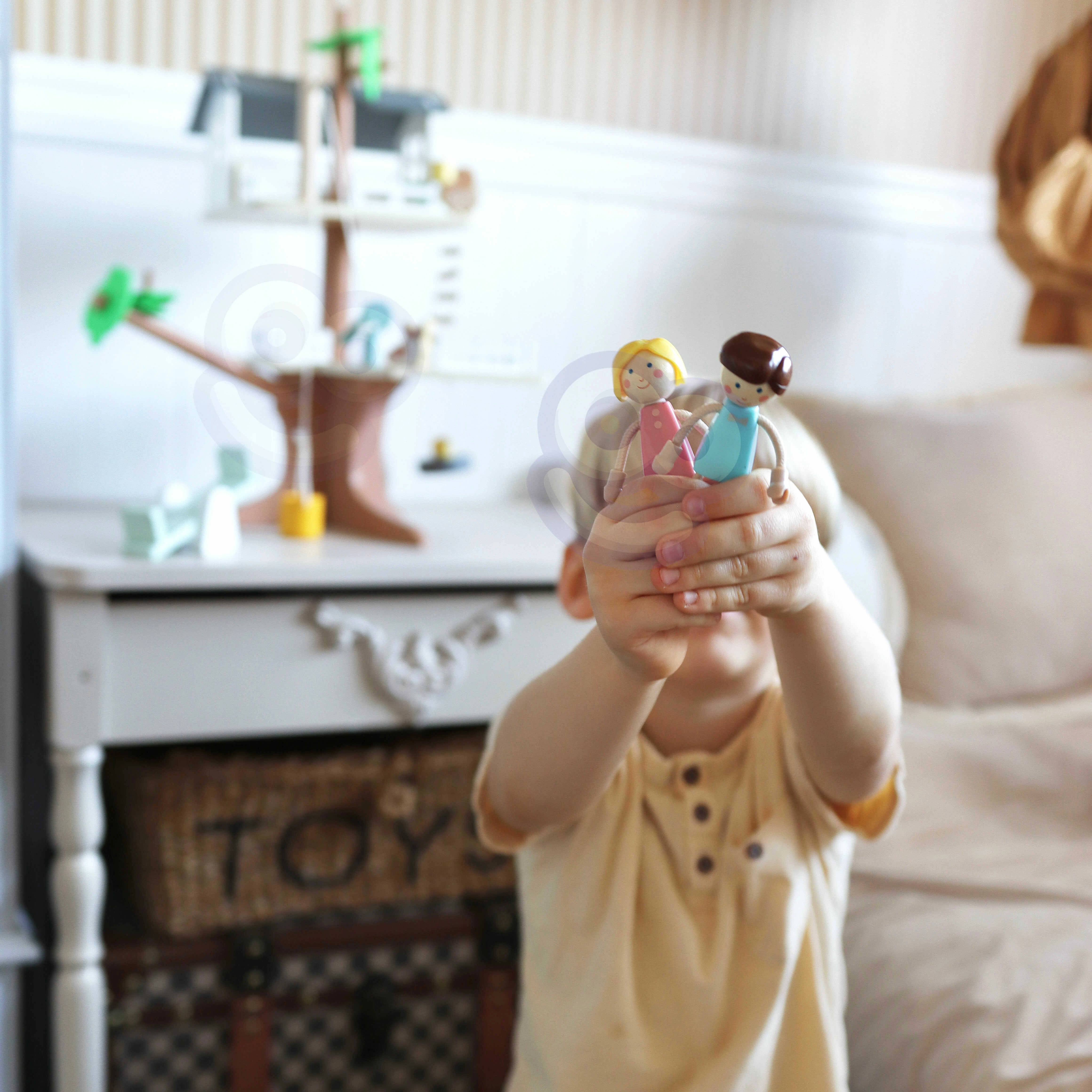 Опаковката съдържа 31 елемента, включително 2 детски фигурки, 2 животинки и аксесоари като люлка, люлка-гума, балансова люлка, легло, маса, стол и сандък със съкровище. Прецизно обработеното естествено дърво с нежни цветове е издръжливо и приятно на допир.