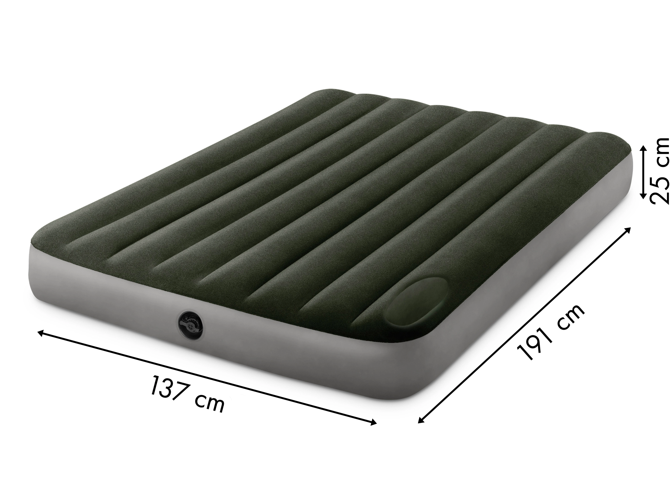 Практичен надуваем двоен матрак с размери 191 × 137 × 25 cm, идеален за дома и къмпинг. Предлага приятна велурена повърхност, вградена крачна помпа за надуване навсякъде и технология Dura‑Beam Fiber за стабилна опора и дълъг живот.