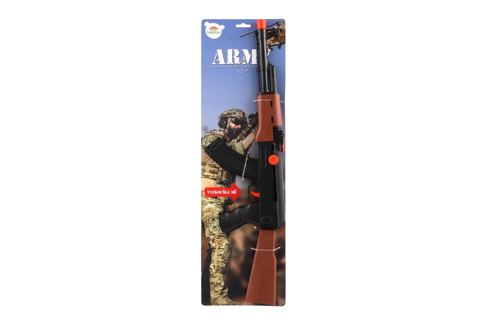 Пластмасовият автомат ARMY носи на децата много забавление без необходимост от батерии. Управлението е лесно – оръжието се навива и е готово за действие. Реалистичната визия стимулира въображението и развива двигателните и координационните умения при игра на войници.