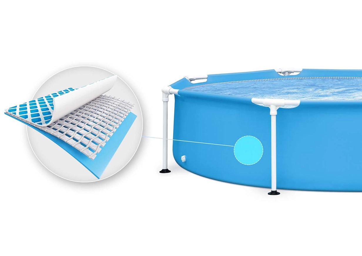 Армировката от найлонова мрежа в средата на стените гарантира дълъг живот и устойчивост на скъсване и атмосферни влияния. Практичният източващ клапан улеснява поддръжката, а свързването на филтърна помпа (не е включена) помага да поддържате водата чиста.