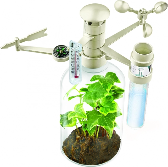 Забавна и образователна метеорологична станция за деца от 5 години. Тази станция позволява на децата да наблюдават и записват данни за времето с помощта на мини обсерватория и да разберат ефектите от парниковия ефект чрез бутилка с терариум.