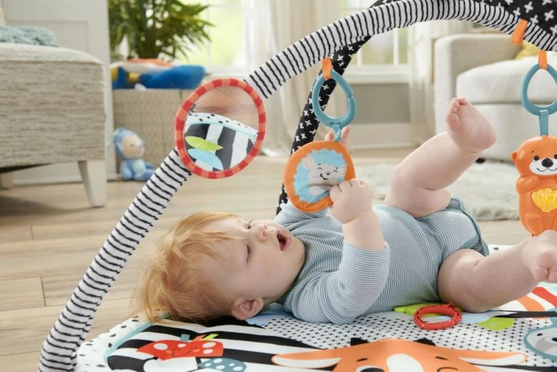 Огледалце, дрънкалки, без BPA гризалка и текстурирани елементи насърчават захвата, координацията око–ръка и откривателството. Високият контраст подпомага ранното зрение.