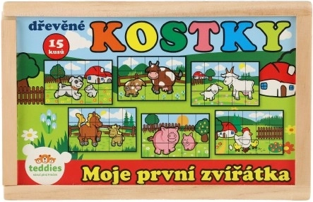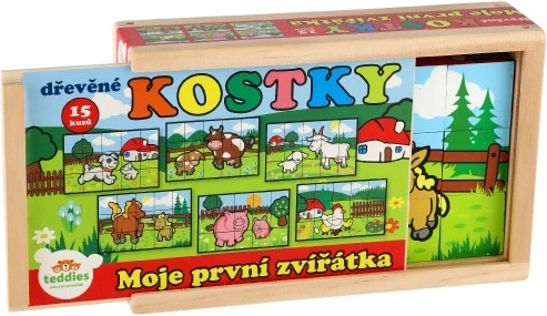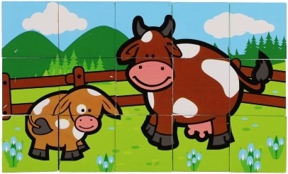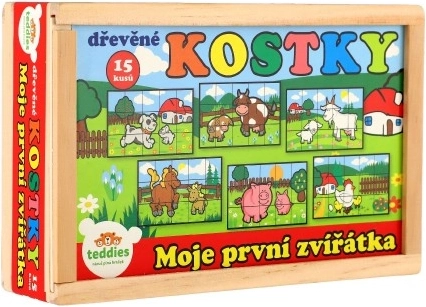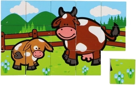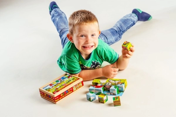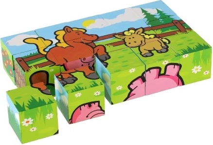 Дървените кубчета с цветни изображения на различни домашни животни са отличен инструмент за детско развитие. При правилно подреждане се появява едно от шестте изображения, което насърчава логическото мислене и въображението у най-малките. По време на строене и събаряне на кули децата разбират принципа на баланса и основите на причинно-следствените връзки.