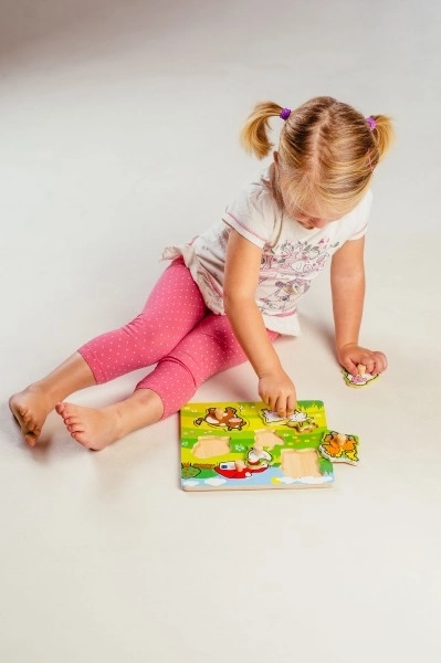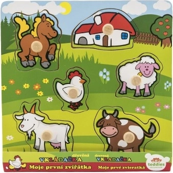 Този пъзел-вложка съдържа общо 5 цветни животни, включително конче, коза, овчица, кокошчица и крава, които са лесни за хващане благодарение на малките дървени дръжки. Всеки от елементите има своето място върху дървена подложка, което също помага на децата да се научат на правилно поставяне на всяка част.