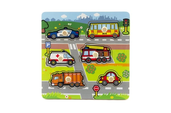 Всеки от шестте вмъкваеми елемента представя различно превозно средство: полицейска кола, автобус, линейка, пожарна кола, сметосъбиращ камион и лек автомобил. Подреждането е лесно благодарение на дървената основа и дръжчиците, които улесняват манипулирането с частите от малките ръчички.