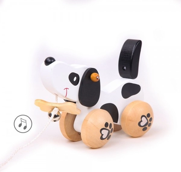 Кученцето е на колелца с мотив на лапички, а опашката му се върти при движение, което добавя игривост. Забавлението се подсилва от звънчето, което стимулира слуховото възприятие на децата. Оборудвано е с връзка, закрепена за кокал в муцуната, което позволява лесно дърпане. Играчката е подходяща както за игра у дома, така и навън.