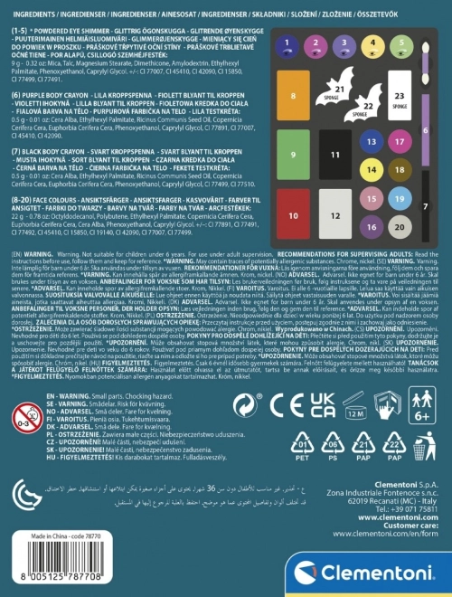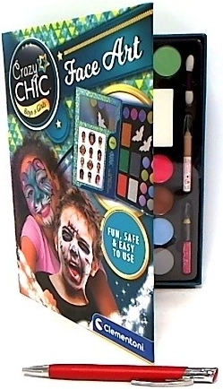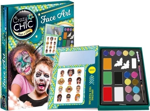 Открийте креативния свят на грима с детския комплект Clementoni Crazy Chic. В елегантната кутия ще намерите всичко необходимо за рисуване по лицето – от сенки за очи и моливи за тяло до апликатор и гъбички. Практичната кутия с огледалце след изразходване се превръща в стилна кутийка за дребни вещи.