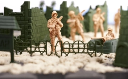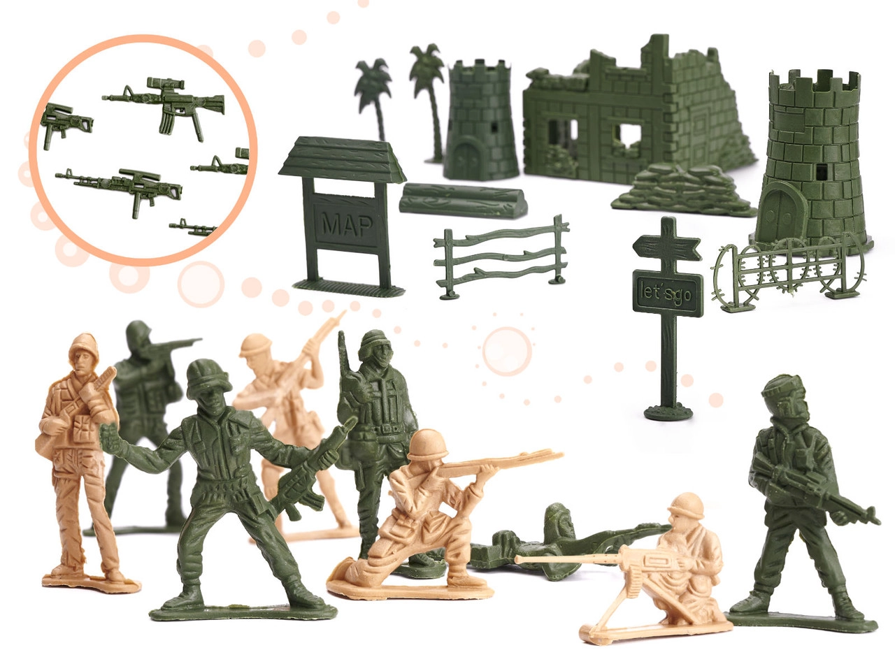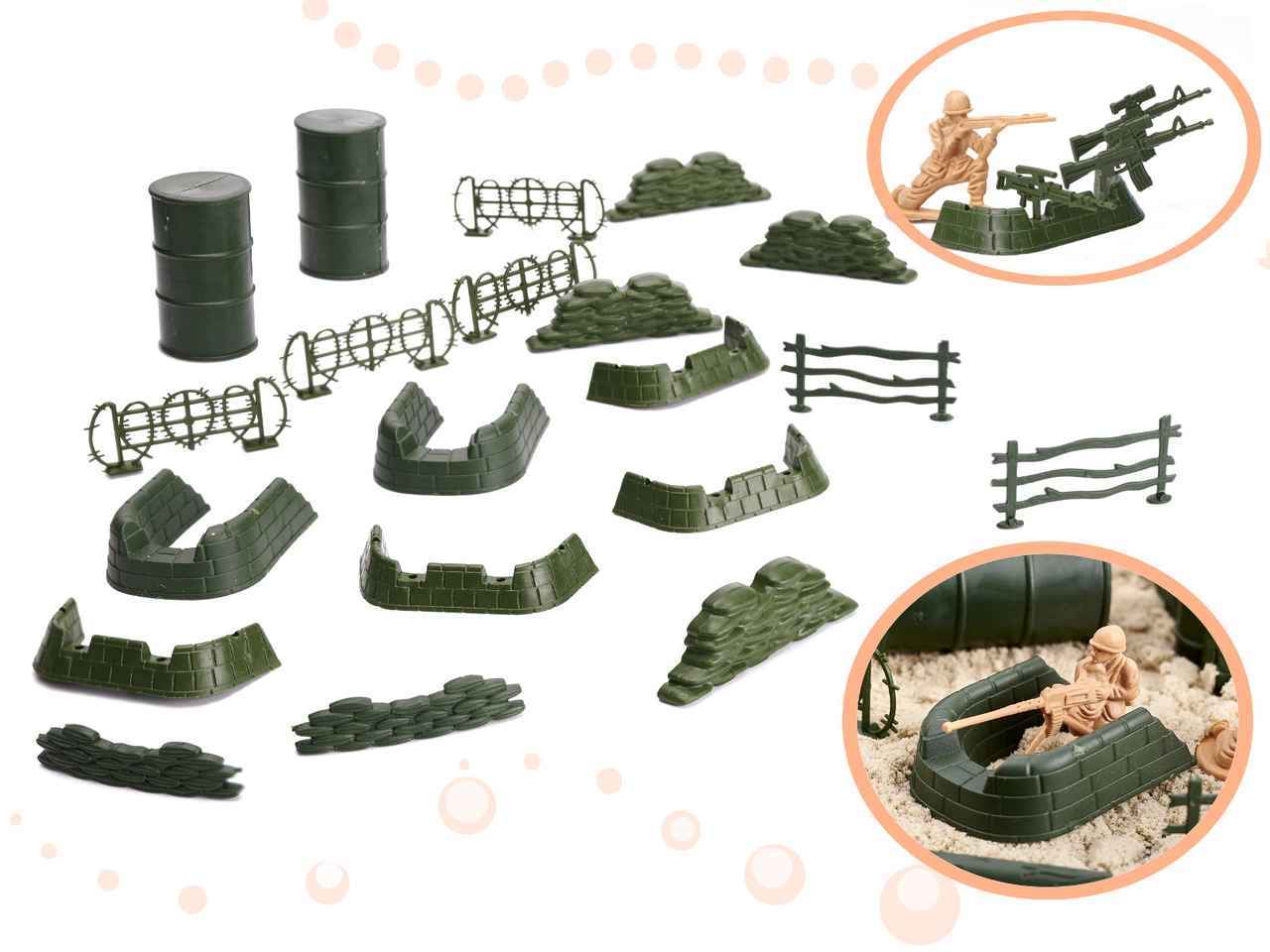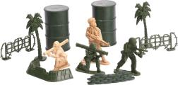 Включени са приблизително 60 фигурки на войници в различни пози и богати компоненти за изграждане на военна база – варели, огради, препятствия, палми и други. Фигурките са с височина около 5 cm, стоят стабилно на равна повърхност и се подреждат лесно.