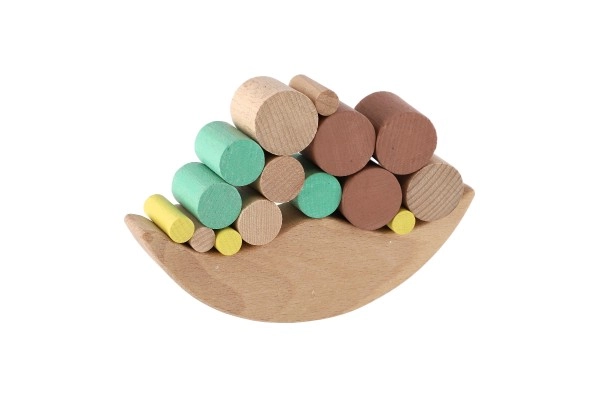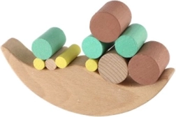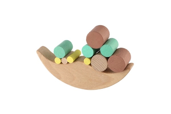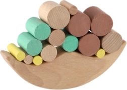Играта съдържа различни блокчета, които децата подреждат върху балансиращата основа, като по този начин упражняват фината си моторика.