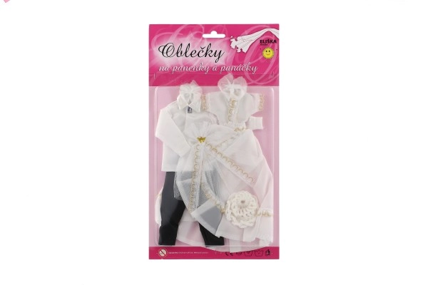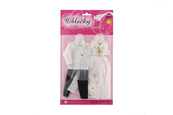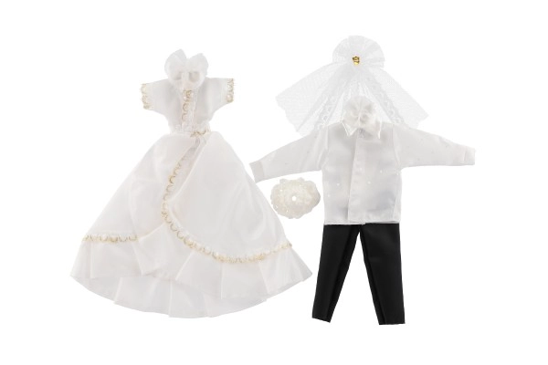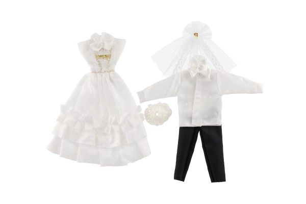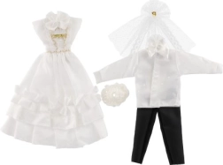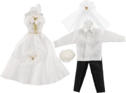 С този уникален комплект сватбени дрехи вашите кукли могат да станат звездите на всяка въображаема сватба! Тоалетите включват детайлно изработена рокля и елегантен костюм, които придават на сватбената ви история магия и блясък.