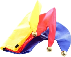 Пъстра клоунска шапка в жълто, червено и синьо с метални звънчета за игрив ефект при всяко движение.
