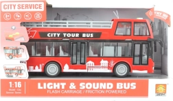 Червен двуетажен туристически автобус от пластмаса е идеалната играчка за малки любители на градските панорами. Издава реалистични звуци и гарантира много забавление.