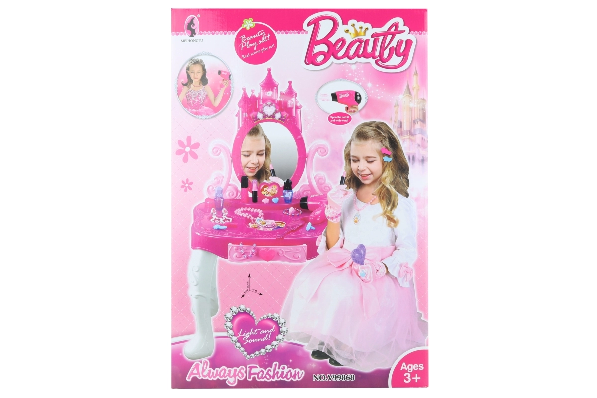 С едно просто натискане на бутон тоалетката светва и започва да свири мелодия, което придава автентичност на играта. Към комплекта е включено и удобно пластмасово столче. Всичко необходимо за игра на красота е осигурено!