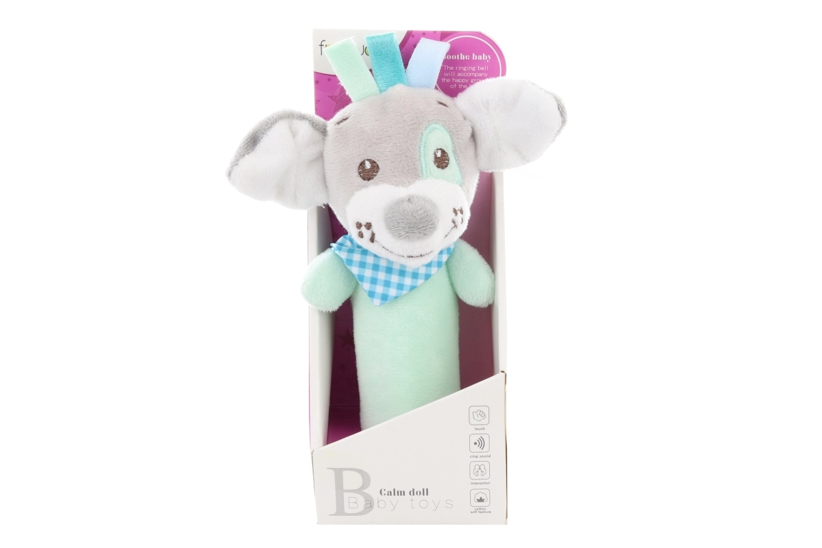 Тази супер мека плюшена дрънкалка със зелено кученце е идеалната първа играчка за новородени. Благодарение на пищялката и дрънчащия звук стимулира слуха, докато ярките цветове и контрастите подпомагат зрителното възприятие. Ергономичната форма улеснява захващането от малките ръчички.
