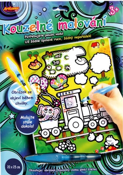 Вълшебното рисуване с вода е идеалният начин да забавлявате вашите малки творци. Нужна е само вода и цветните картинки се появяват веднага щом навлажните специалния бял слой. След няколко минути изсъхване картината отново се покрива с бял цвят, така че можете да рисувате непрекъснато отново и отново.