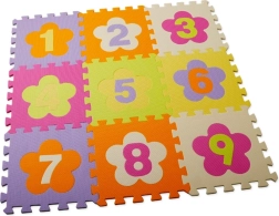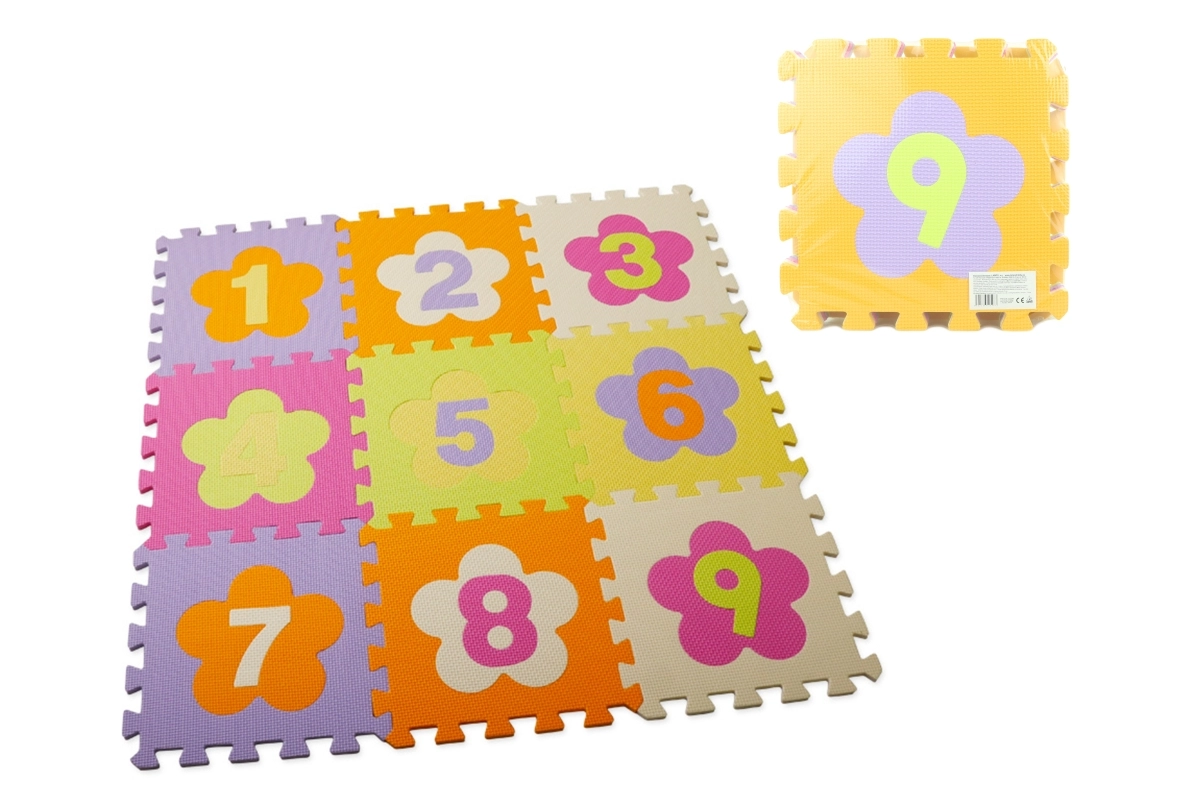 Цветни пенови пъзели с цифри и изваждащи се елементи създават мека и безопасна игрална подложка за деца от 3 години. Елементите с размер 28 × 28 см се свързват лесно, имат релефна неплъзгаща се повърхност, са миющи се, поглъщат шума и изолират от студ. Комплектът съдържа 9 квадратни части.