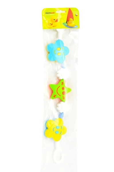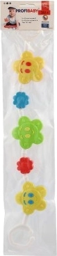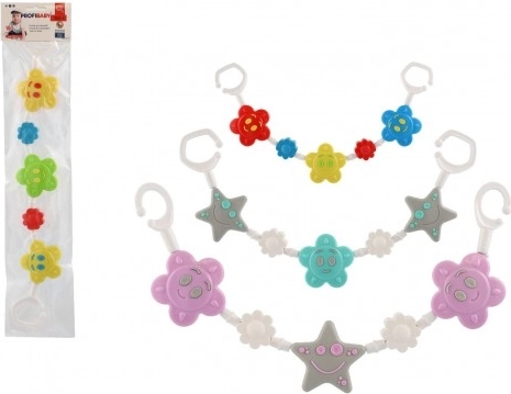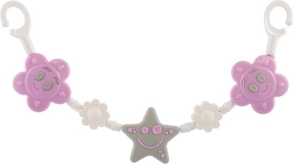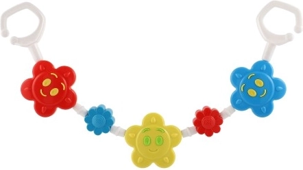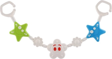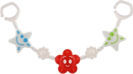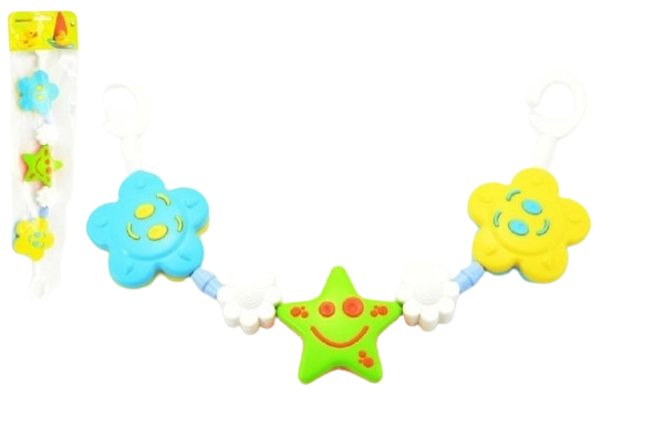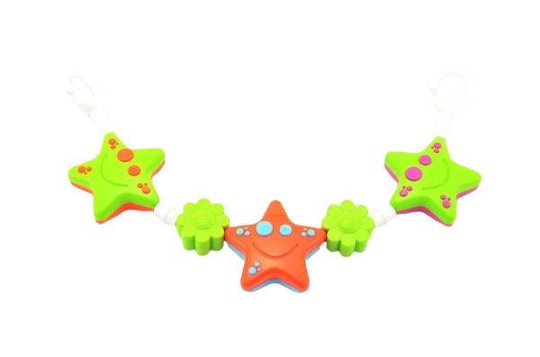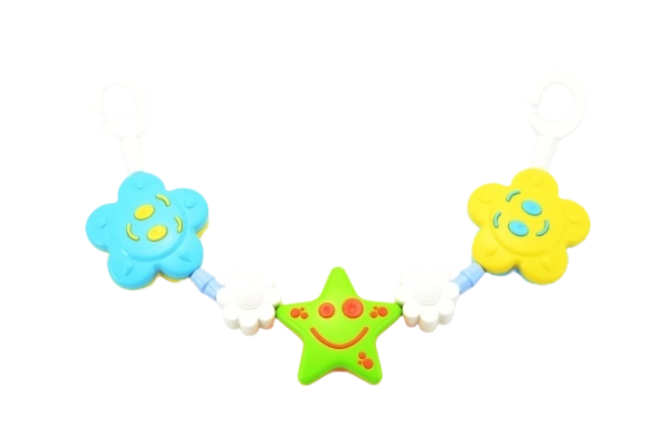 Тази цветна верижна играчка със слънчице и звездички лесно се прикрепя към количка, столче за кола или кошара. Подпомага зрителното възприятие, фината моторика и забавлява бебето по време на път и у дома. Благодарение на издръжливата пластмаса и безопасната изработка е идеална за ежедневна употреба.