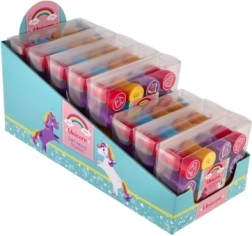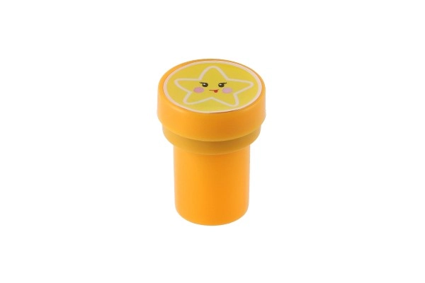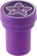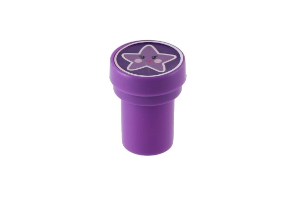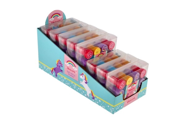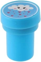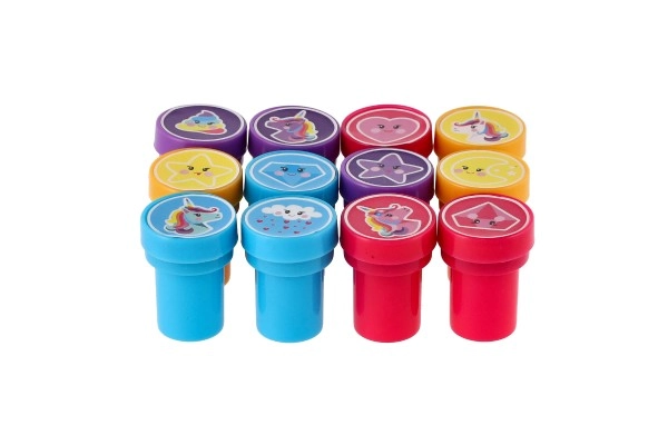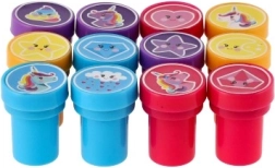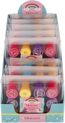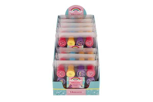 Комплектът предлага пъстра палитра от сладки мотиви (еднорози, звезди, сърчица, облаци и др.) в 4 весели цвята. Печатите са с компактна големина 3 cm, удобно пасват на малка детска ръка и развиват фината моторика и въображението.