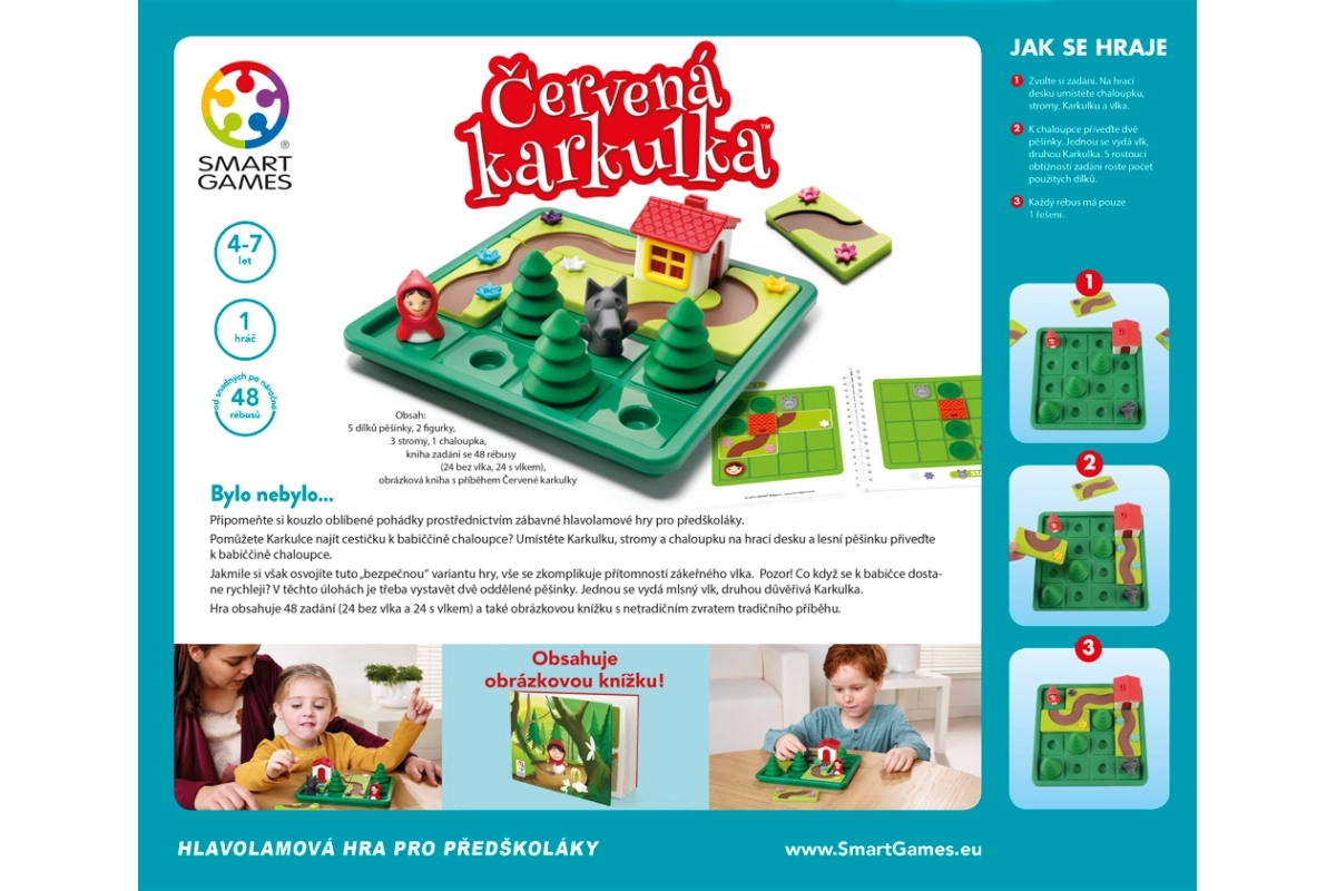 Главоблъсканицата Червената шапчица съчетава забавление и учене за най-малките. Подредете фигурките и горските елементи върху дъската и създайте път до баба. Идеална е за развитие на стратегия и логическо мислене при децата:
