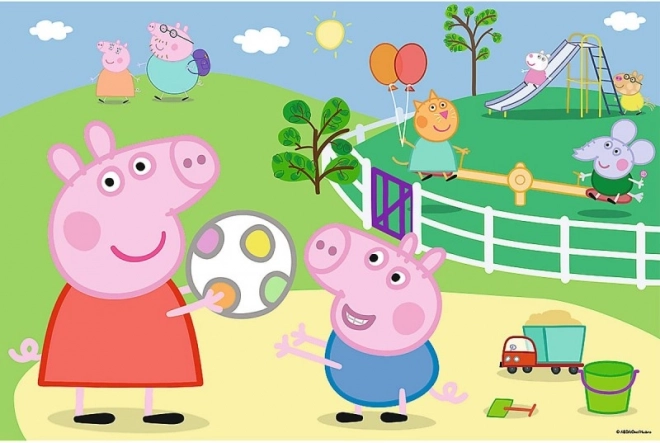Зарадвайте малките почитатели на приказката PEPPA PIG. След подреждане се получава пъстра сцена от площадката, която мотивира децата да разказват истории и тренира търпението. Благодарение на по-големите и прецизно изрязани части пъзелът се подрежда удобно и е чудесен за първи пъзели.