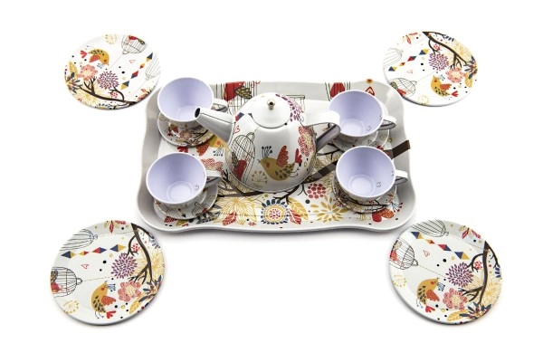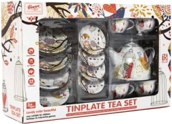 Стилен калаен чаен комплект ще зарадва всяка малка домакиня. Позволява организиране на забавни чаени партита, подпомага ролева игра и развитието на фантазията. Комплектът съдържа 15 части и е идеален за деца от 3 години.