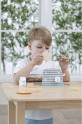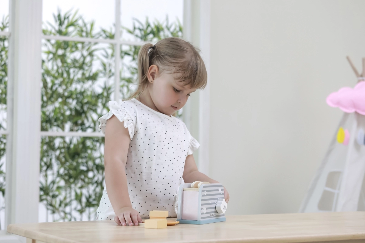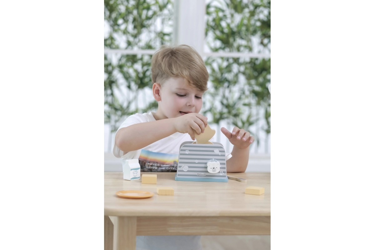 Дървеният тостер е проектиран да осигури на децата безопасен и забавен начин за игра на кухня. С изчистен дизайн и издръжлива конструкция е идеален за въображаеми игри и развитие на моторните умения.