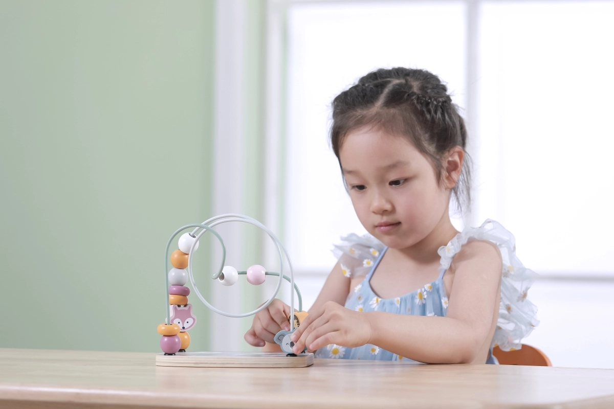 Мъниста-лабиринтът подпомага подобряването на координацията око-ръка и фината моторика, докато децата преместват мънистата по металните пътеки.