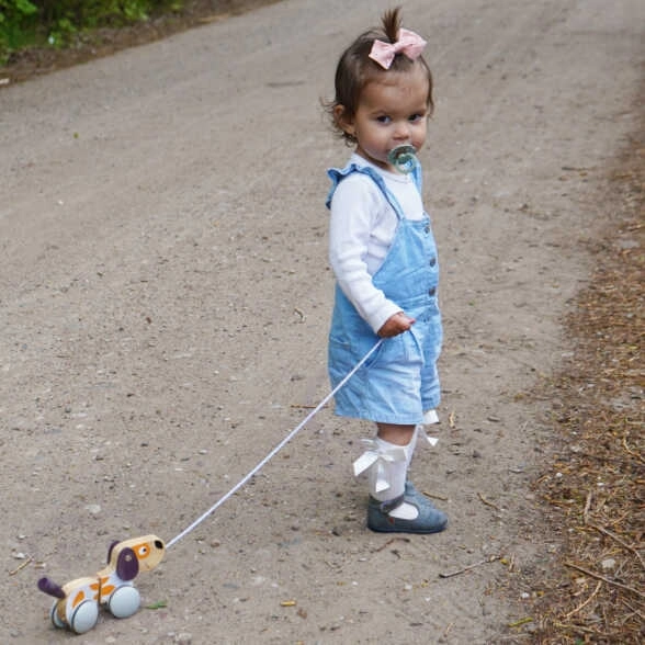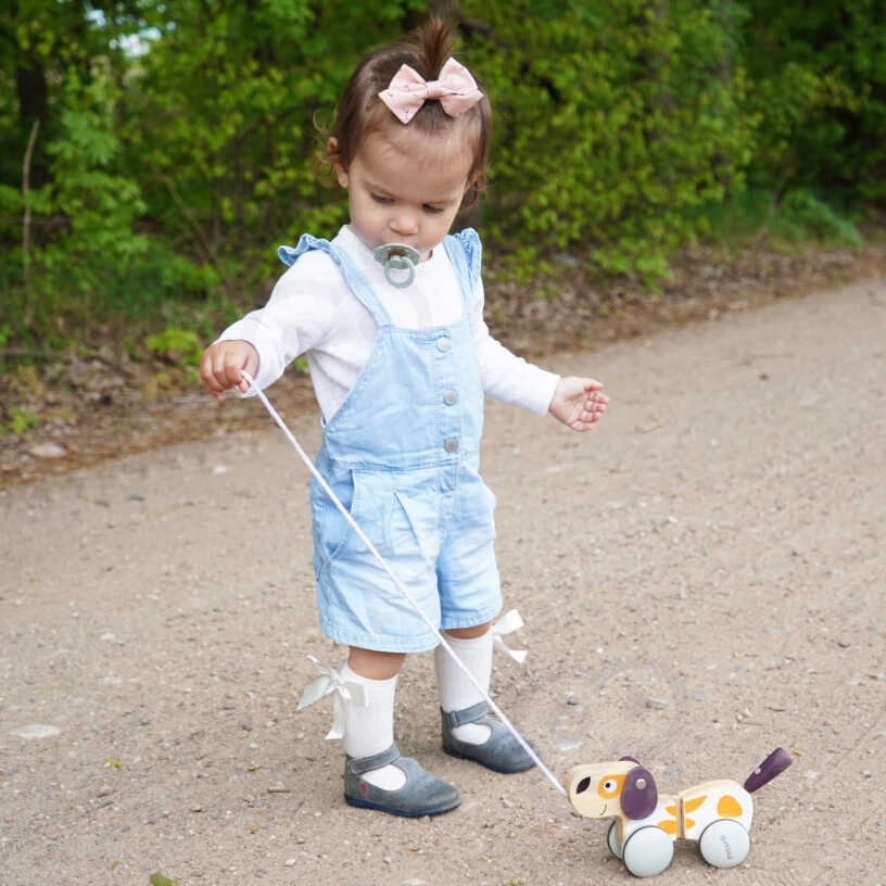 Кученцето за дърпане мотивира децата да ходят, укрепва координацията и ги учи да пазят равновесие. Благодарение на удобната връв воденето е естествено и забавно.