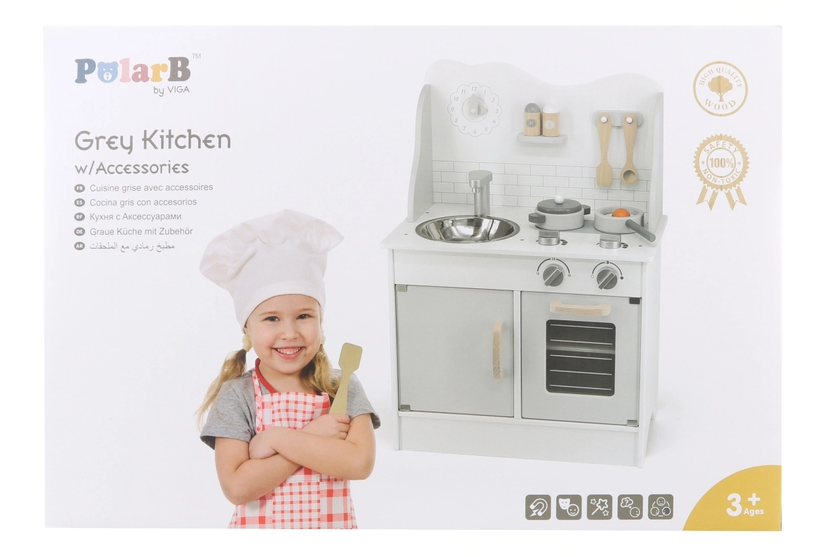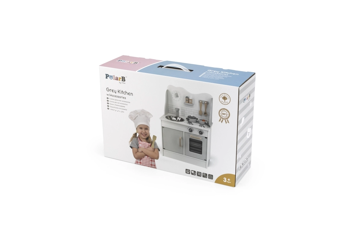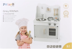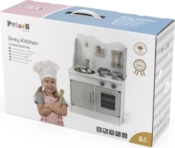 Стилната дървена кухня POLARB в сиво превръща детската стая в малко кулинарно студио. Включва висяща мивка, фурна и котлон и се доставя с богато оборудване за реалистична игра. Въртящите се превключватели със звук „клик“, четим кухненски таймер и шкаф за съхранение на съдове подпомагат самостоятелността, креативността и забавното учене.