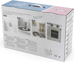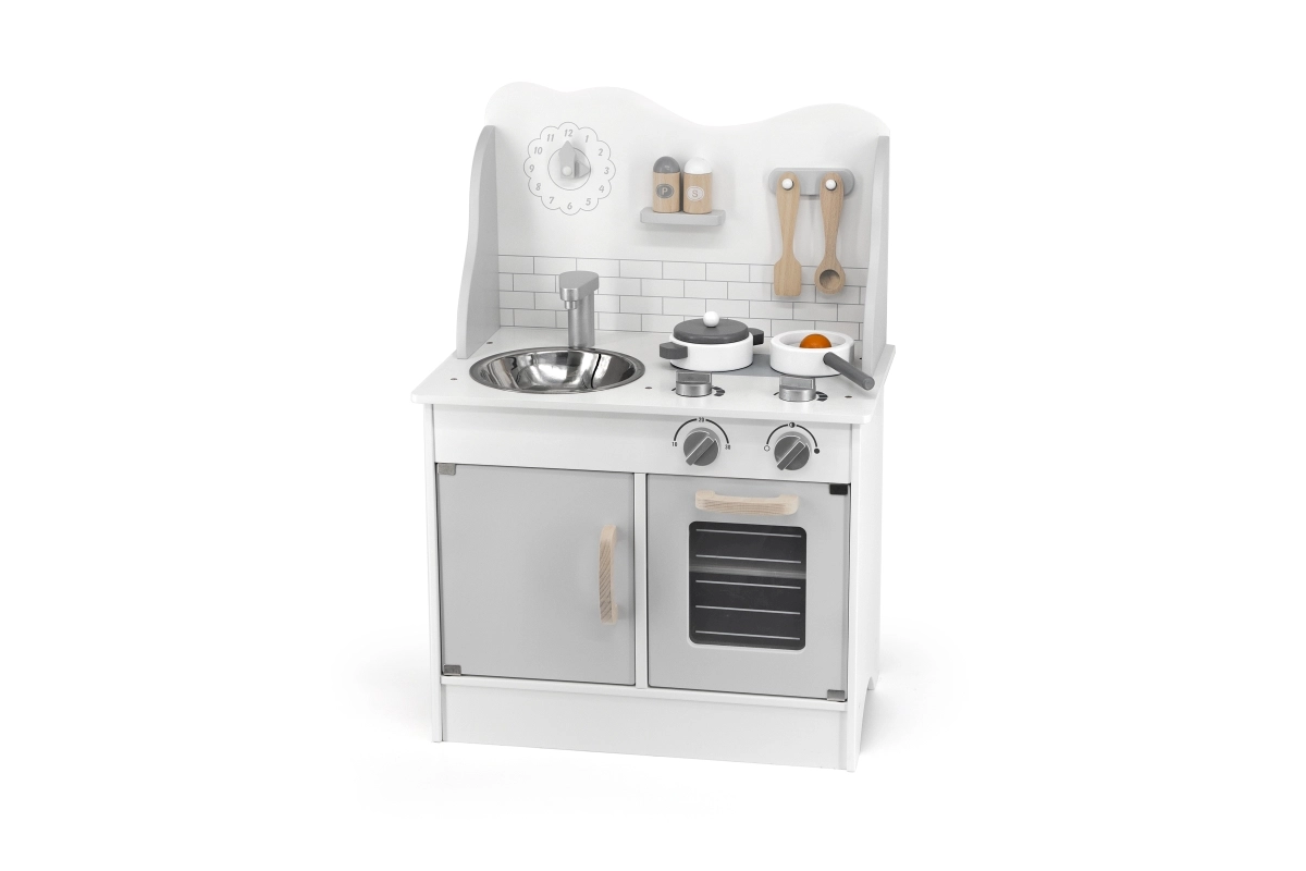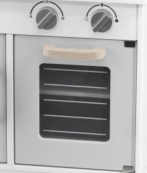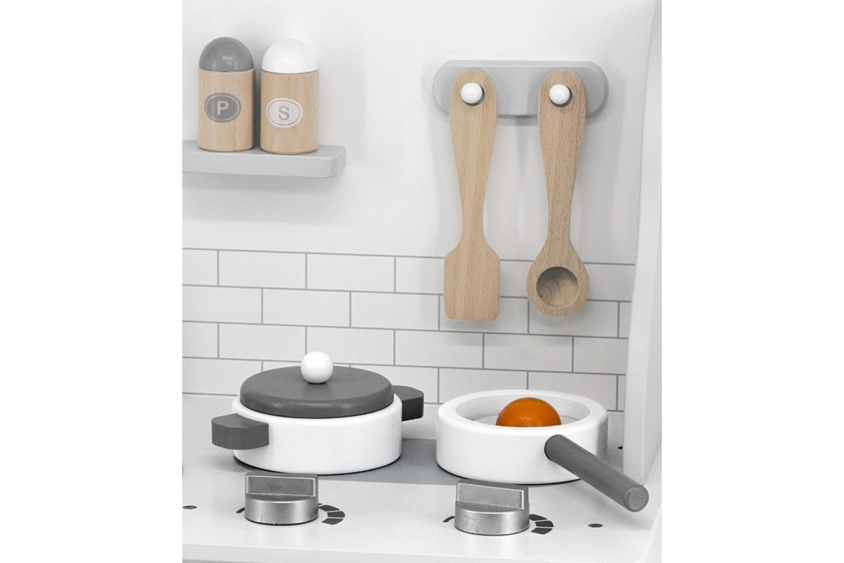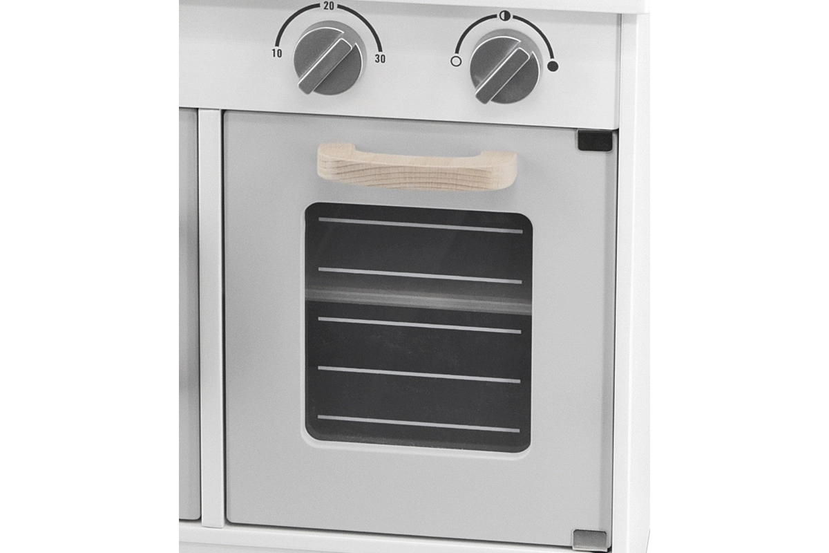 Включен е богат набор от аксесоари: тенджера с капак, тиган с пържено яйце, лъжица, решетъчна шпатула, шпатула и солница с пиперница. Въртящите се 4 копчета със звук „клик“ и ясен звънящ таймер придават реалистичен характер на играта. Долният шкаф служи като място за съхранение на храни и съдове и учи децата на ред.