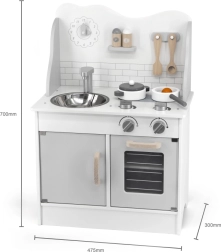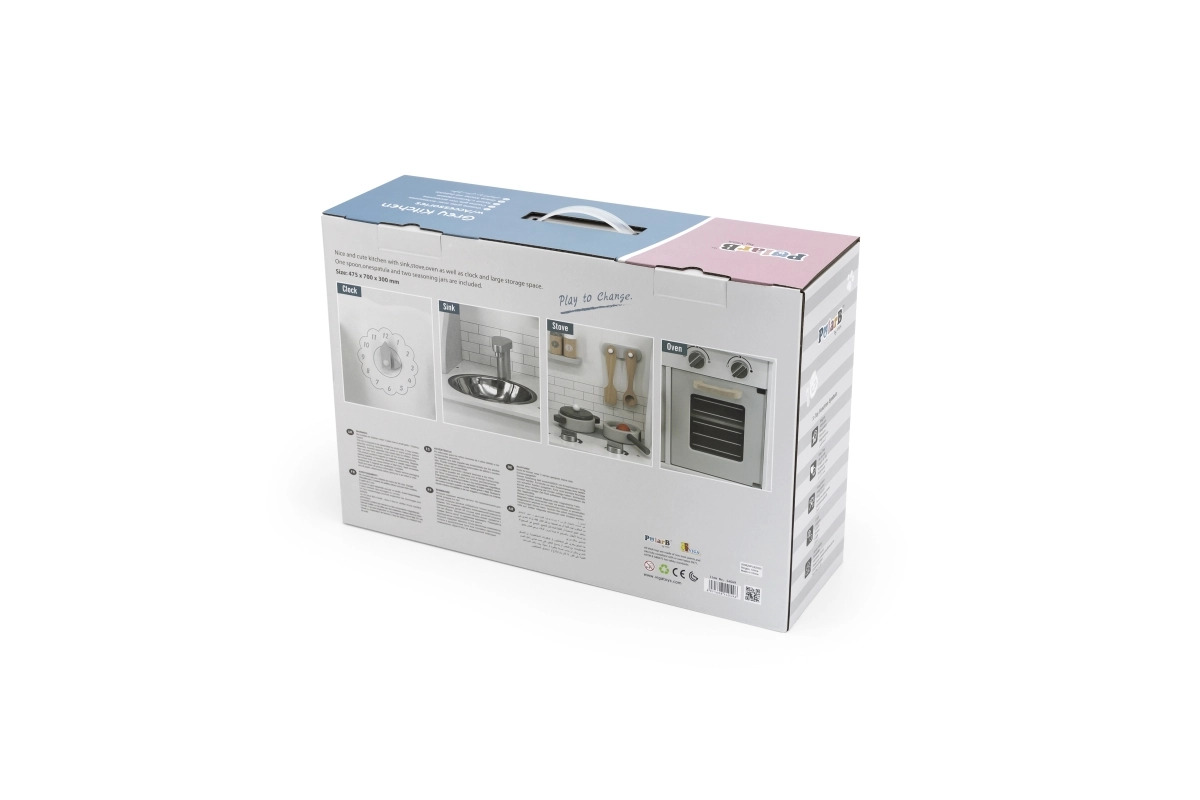 Детската кухня POLARB Eco Grey е добре обмислена играчка за малки готвачи, която съчетава забавление и развитие на умения. Здравата дървена изработка с нетоксични бои в „полярни“ оттенъци изглежда елегантно и устоява на ежедневни игри. Децата ще изпробват приготвяне на ястия на котлоните, печене във фурната и миене на съдове в мивката – точно като възрастните.