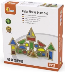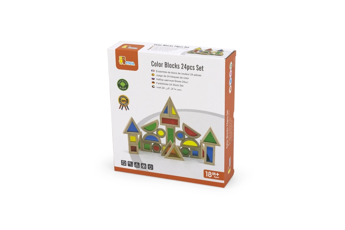 Комплектът от 24 дървени цветни блокчета Viga е предназначен за деца от 18 месеца. Този образователен и забавен продукт подпомага креативността и развитието на фината моторика при малките деца, като същевременно е безопасен за тях.