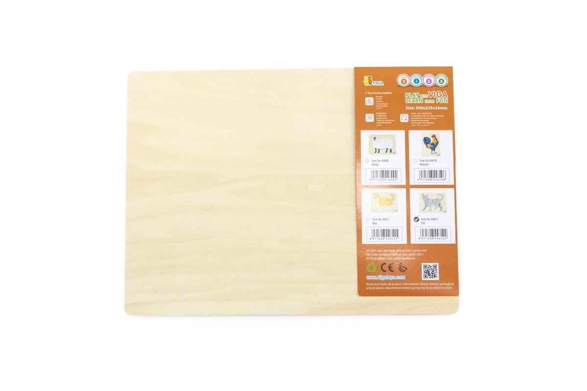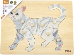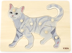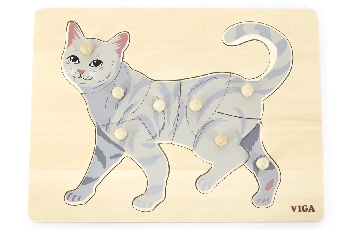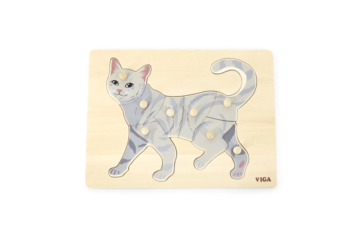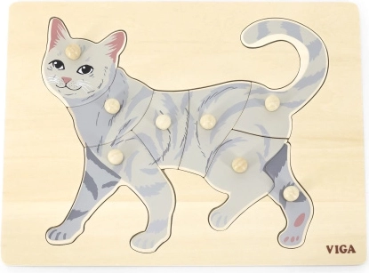 Задачата на детето е да подреди изображението на котка не само по илюстрация, но и по формата на отделните елементи. Копчестите дръжки улесняват захващането с малки пръсти и подпомагат правилното водене на ръката. Здравата дървена дъска държи елементите сигурно на място и издържа на ежедневна употреба.