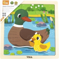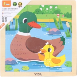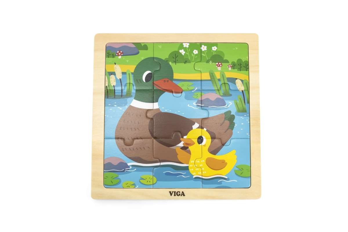 Детският дървен пъзел с мотив на патица и патенце носи забавно учене чрез игра. Девет здрави части се подреждат в дървена рамка и създават весел образ на езерце. Ярки цветове, издръжлив материал и добре обмислена форма на частите улесняват манипулацията и първите успехи при подреждане.