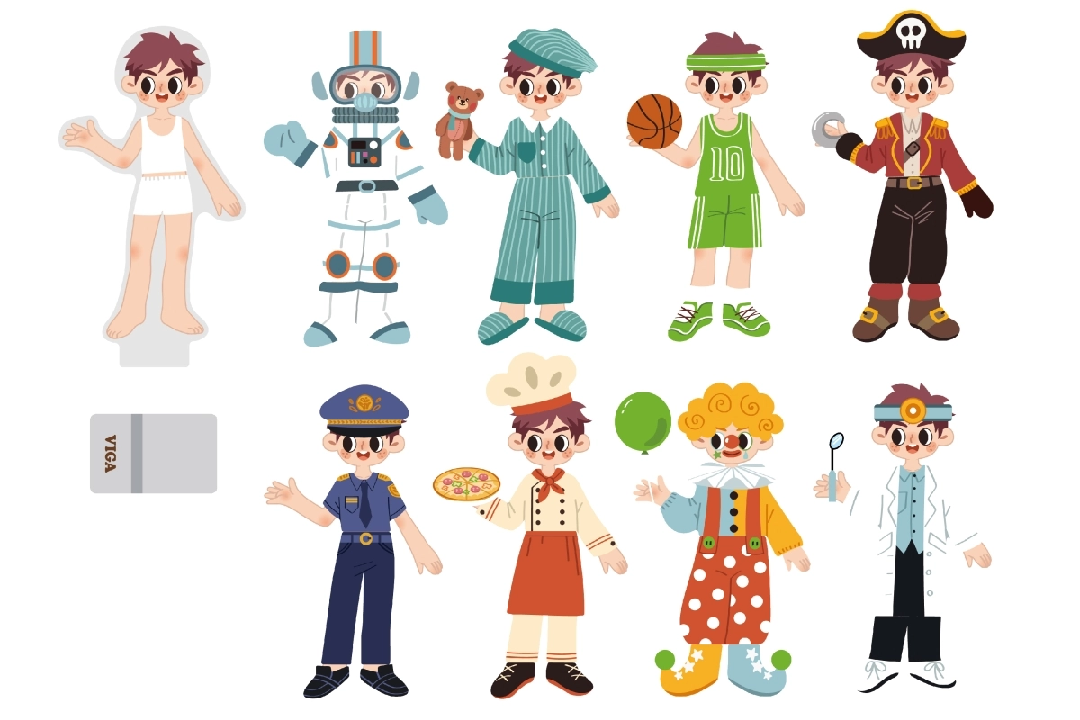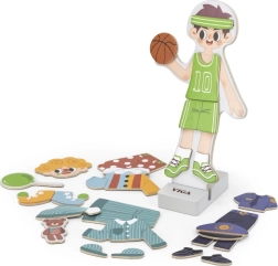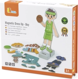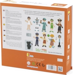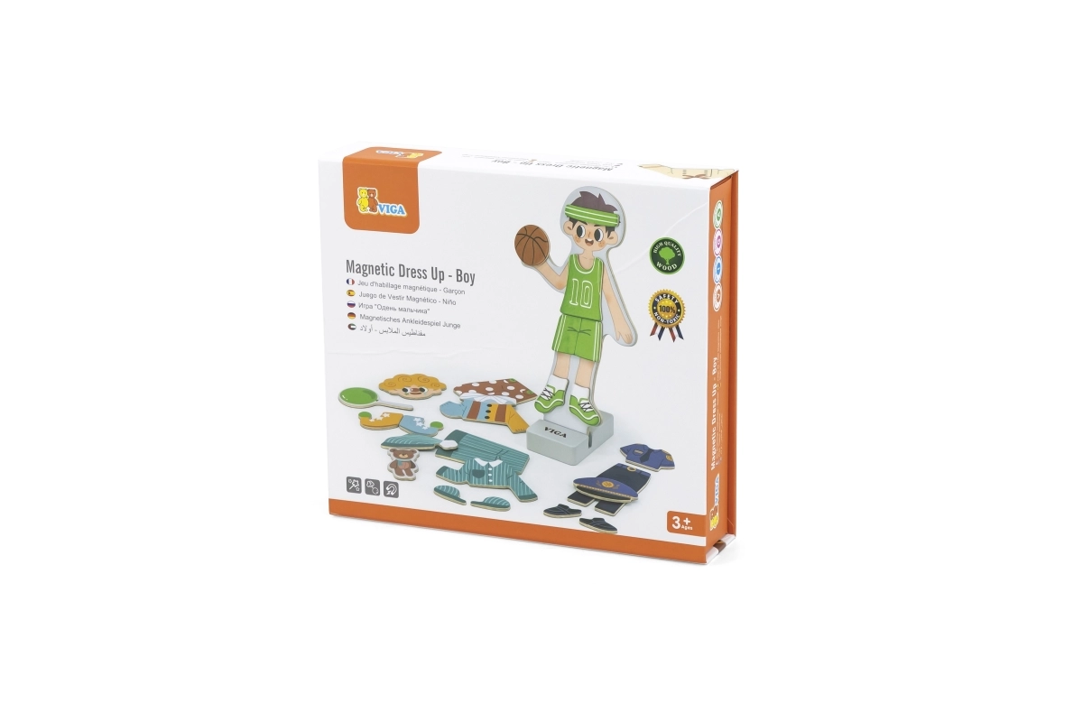 Тази висококачествена дървена играчка от марката VIGA предлага забавно преобличане на магнитна фигурка на момче. Благодарение на различните дрехи и аксесоари децата лесно създават оригинални тоалети, упражняват пръстчетата и се учат да комбинират цветове и стилове.