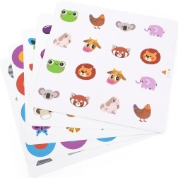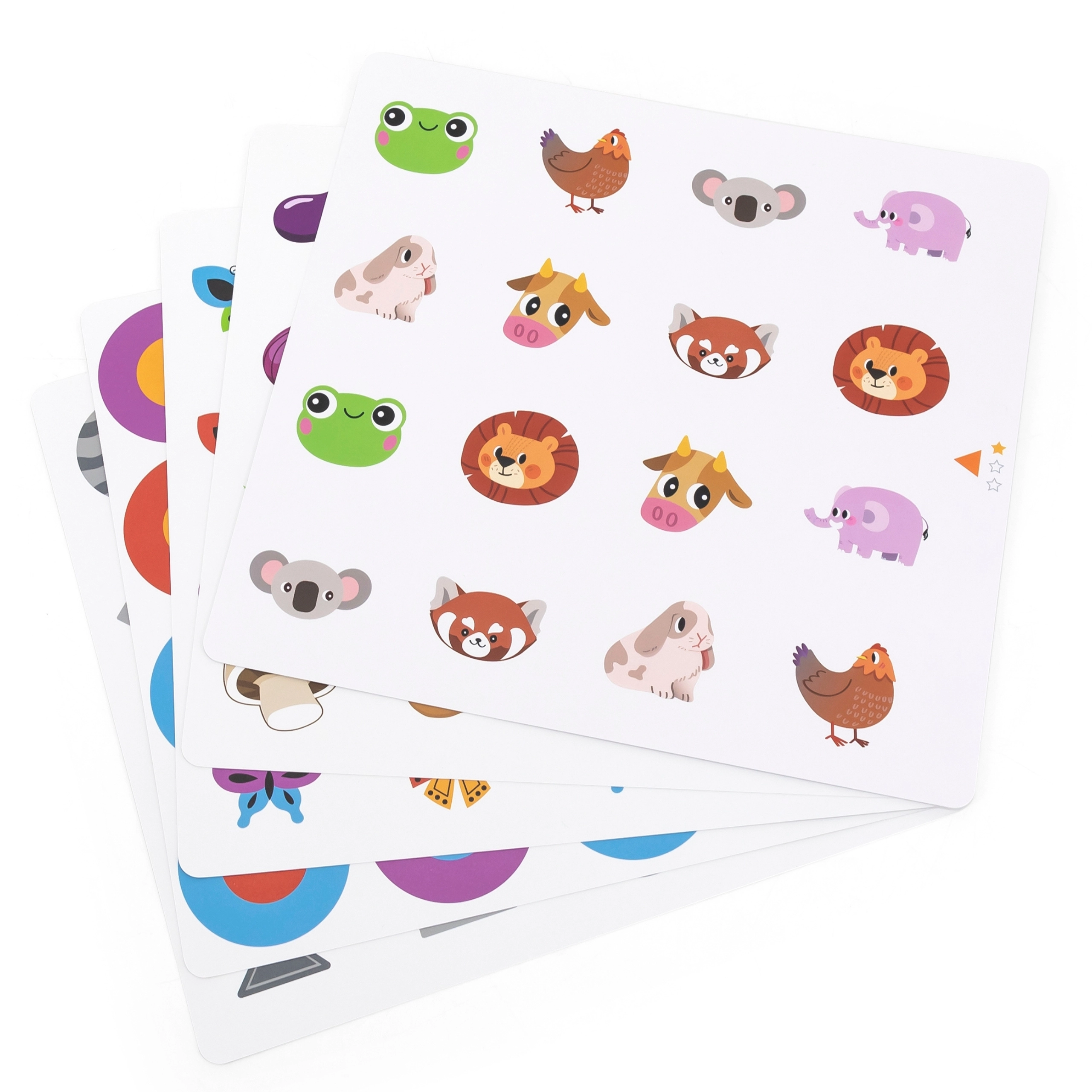 Включени са 10 двустранни карти с разнообразни мотиви (животни, предмети, растения). Лесно ги сменяте и напасвате темите и трудността към възрастта на детето.