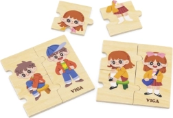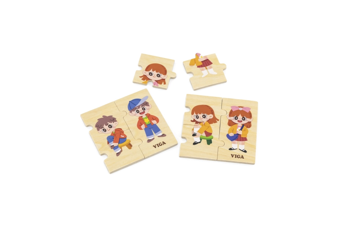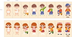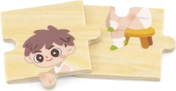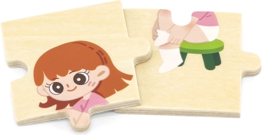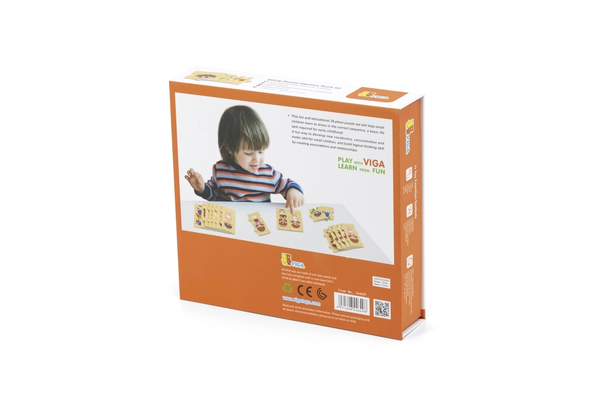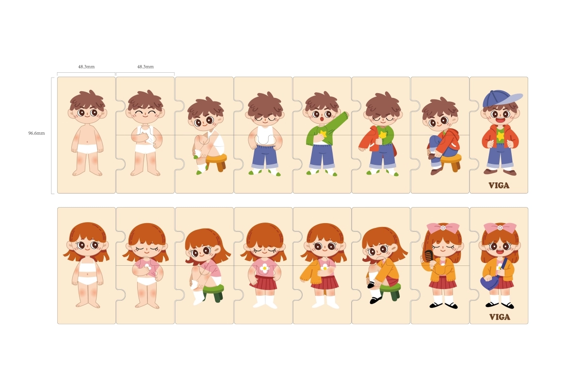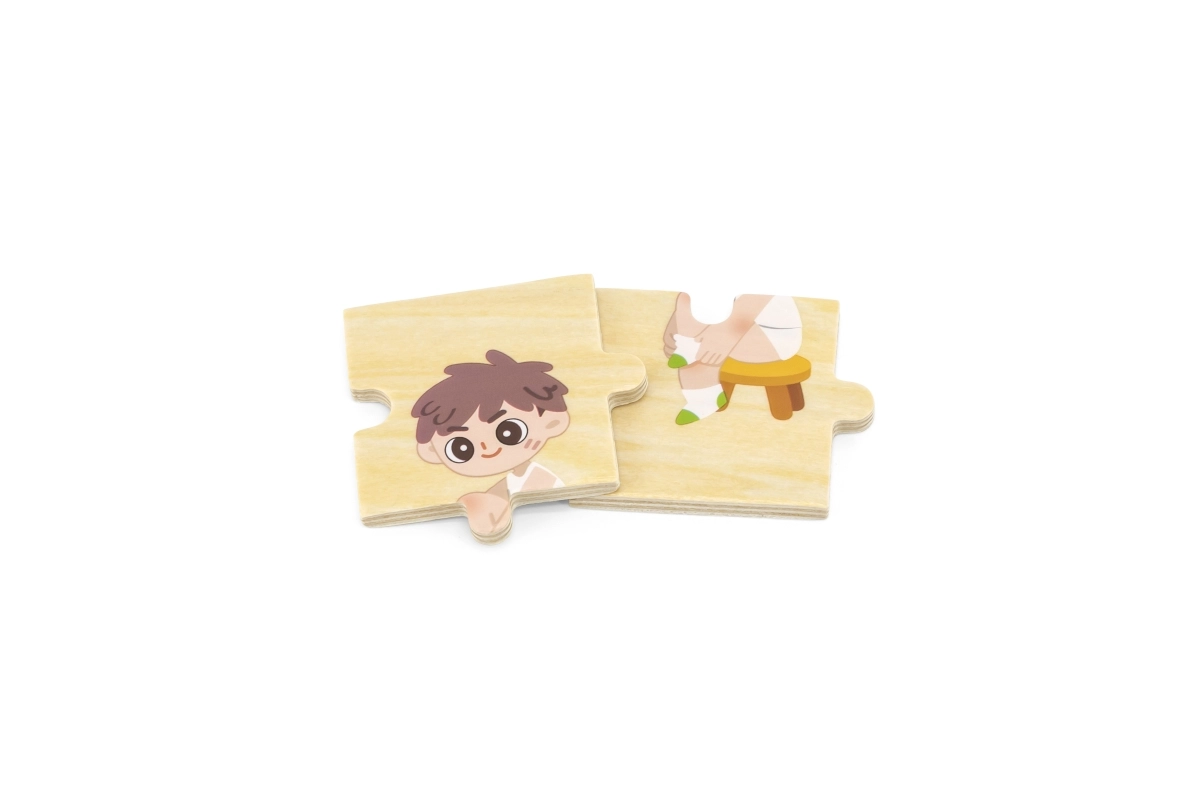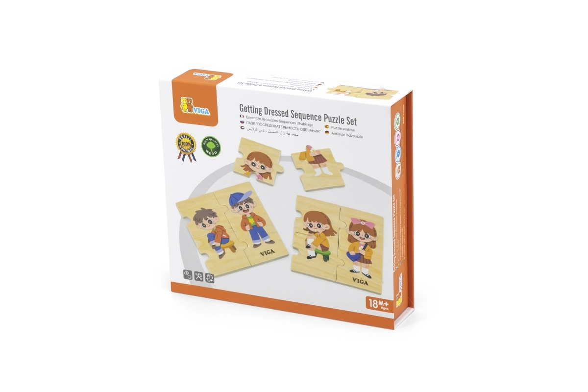Тази качествена дървена образователна играчка учи децата на правилния процес на обличане чрез подреждане на последователни елементи с изображения на момче и момиче. Всеки елемент има уникален мотив и прецизно се напасва, така че децата по време на игра тренират възприемането на връзки и търпение.