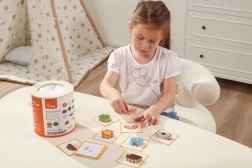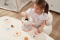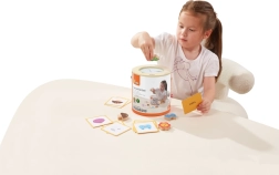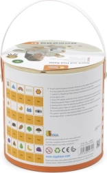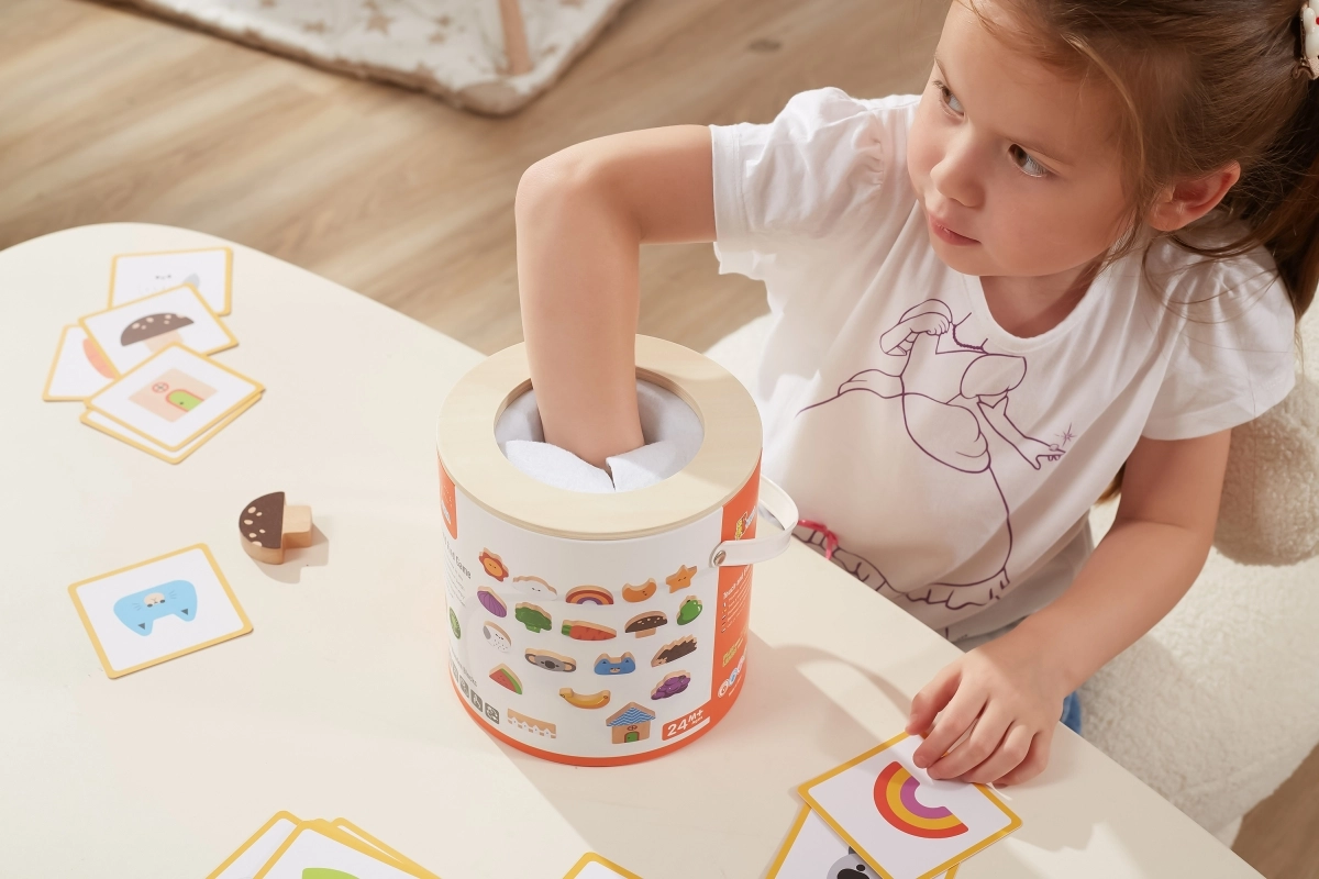 Детето пъхва ръка в тубуса, по допир разпознава дървен предмет и го съпоставя с картата. Отлично за развитие на сетивното възприятие и концентрацията.