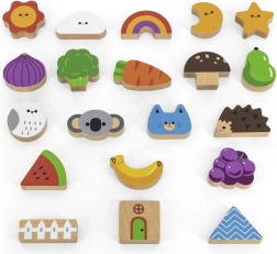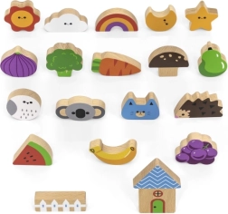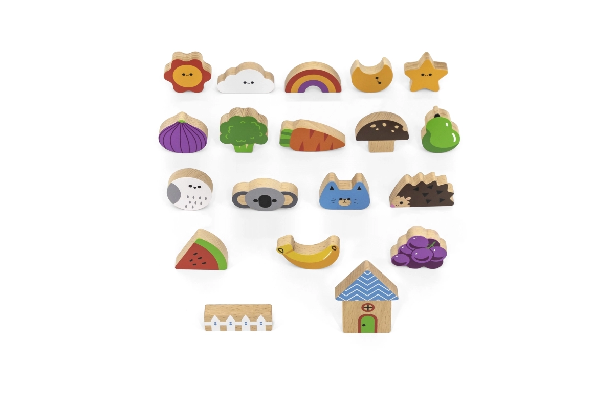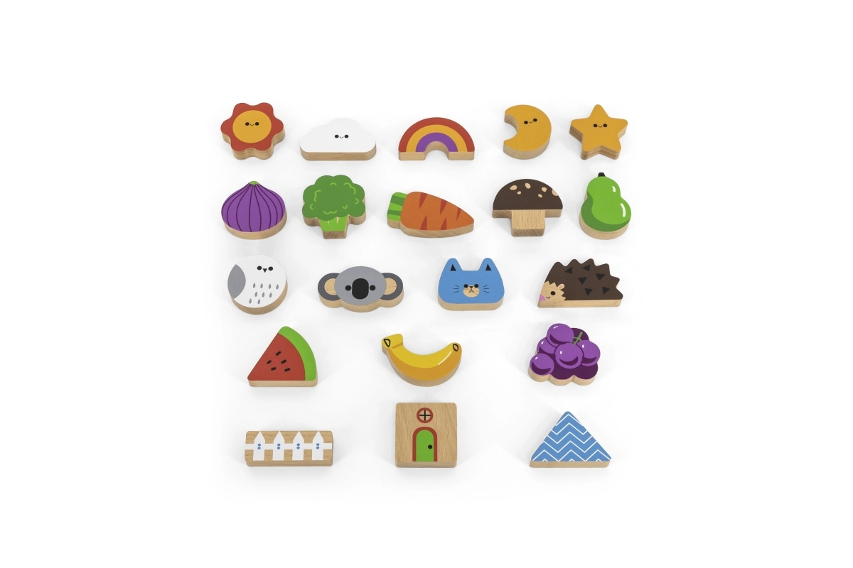 Пъстри дървени форми и илюстрирани карти, които са издръжливи, безопасни и приятни на допир. Идеални за детски ръчички.