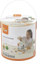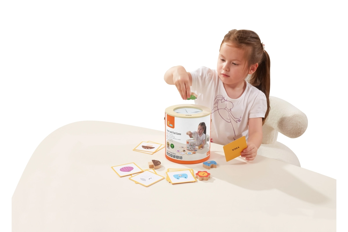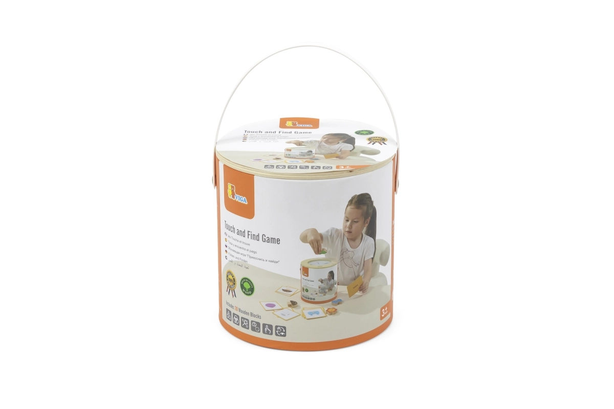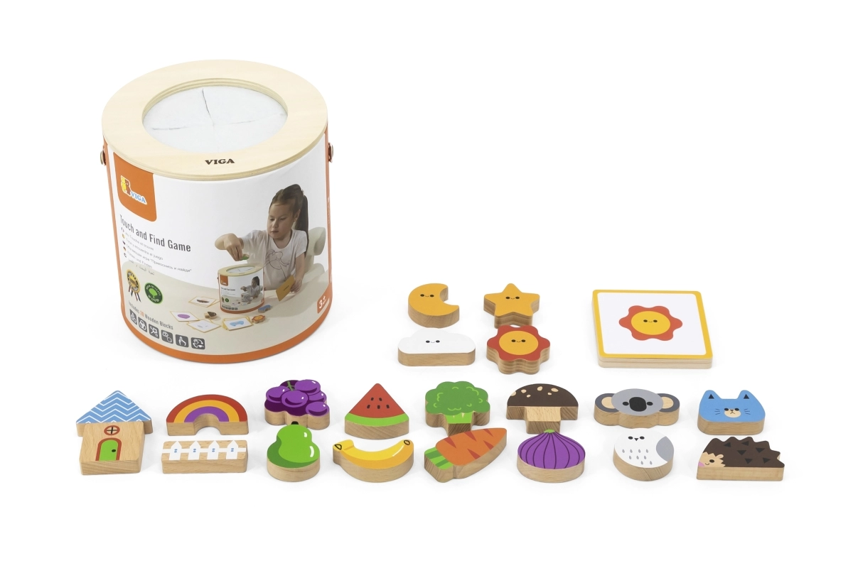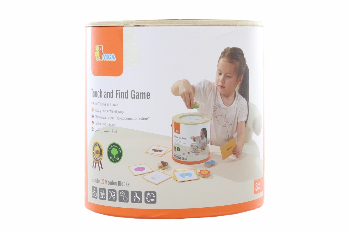 Играта „Touch and Find“ от марката VIGA развива естественото любопитство на децата и насърчава ученето под формата на игра. Детето пъхва ръка в тубуса, напипва форма и по изображенията на картите се опитва правилно да я намери, отгатне и съотнесе. Благодарение на пъстрите мотиви (плодове, животни, предмети) упражнява различаването на форми и цветове, както и речниковия запас.