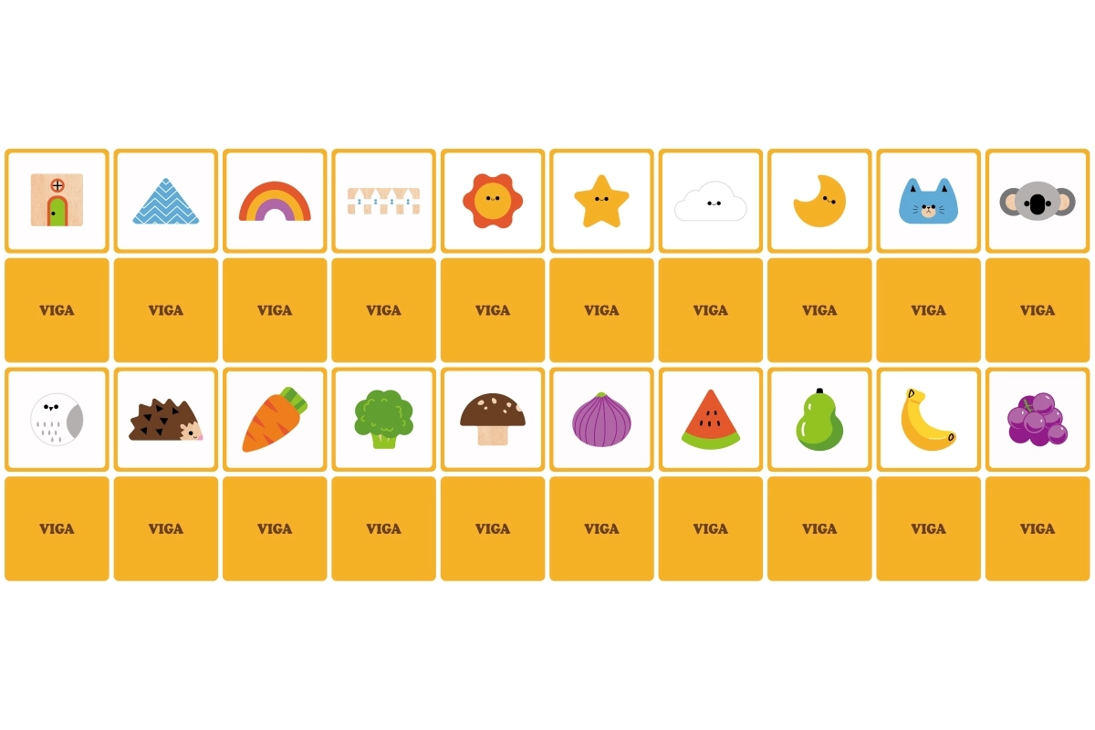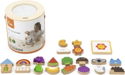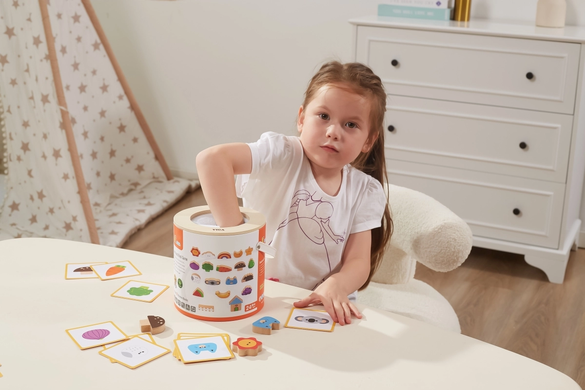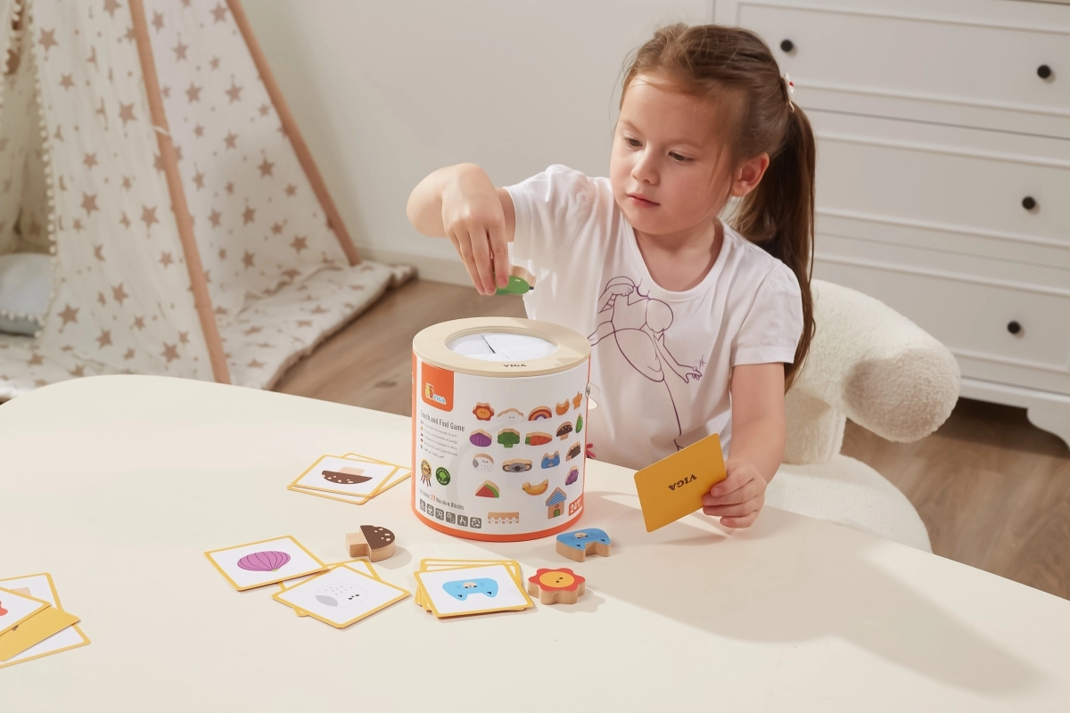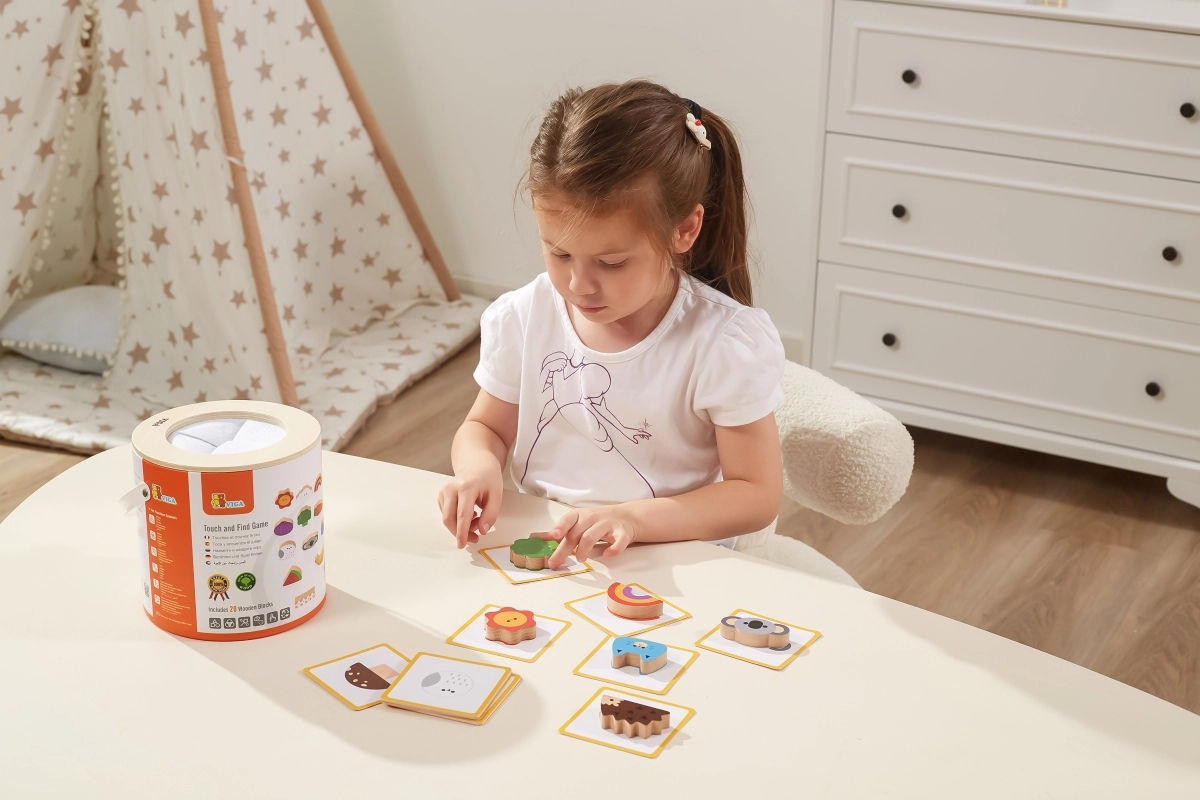 Играта „Touch and Find“ от марката VIGA развива естественото любопитство на децата и насърчава ученето под формата на игра. Детето пъхва ръка в тубуса, напипва форма и по изображенията на картите се опитва правилно да я намери, отгатне и съотнесе. Благодарение на пъстрите мотиви (плодове, животни, предмети) упражнява различаването на форми и цветове, както и речниковия запас.