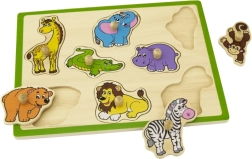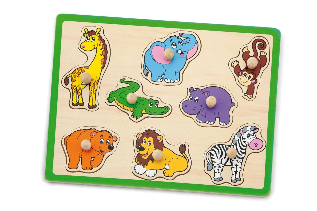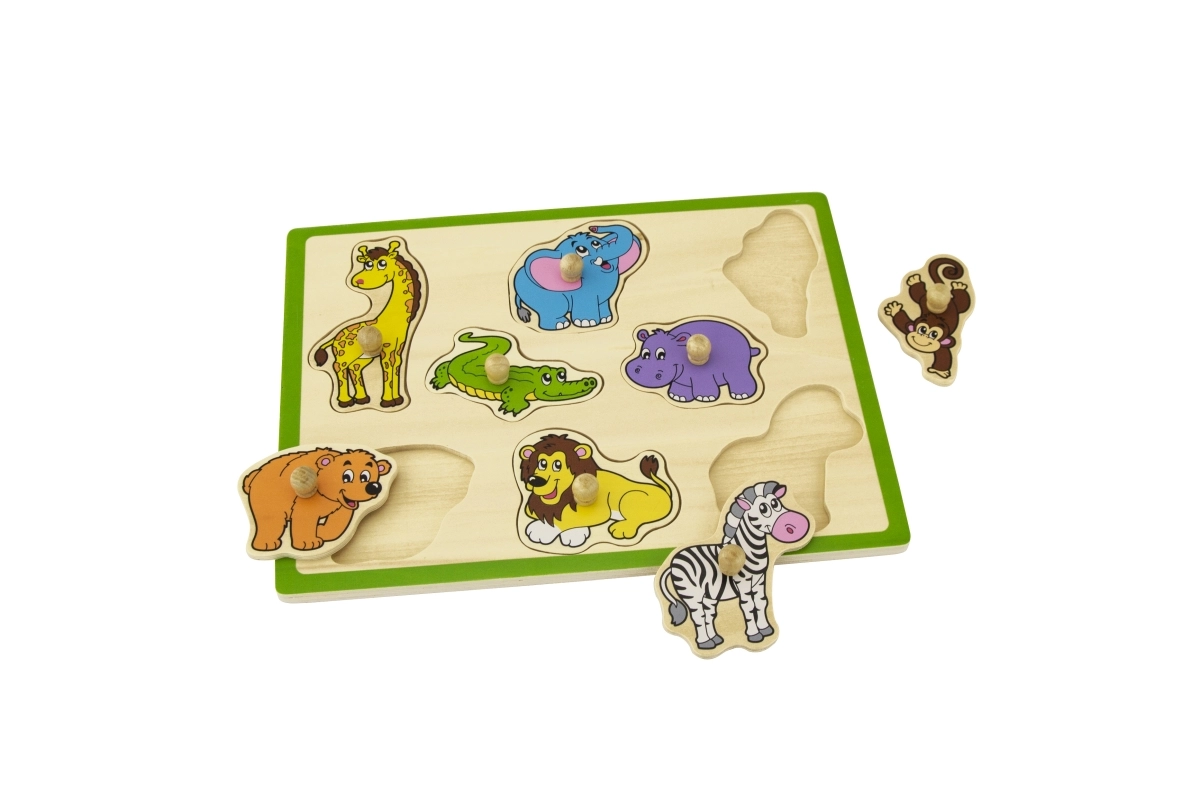 Тази висококачествена дървена влогова играчка с мотив джунгла носи на децата радост от откриването на животни като жираф, слон, крокодил, лъв и зебра. Всяка част има практична дървена дръжка за лесно хващане и прецизно поставяне в съответната форма. Здравата дъска с отчетлив зелен кант е устойчива и стои стабилно както на маса, така и върху подложка.