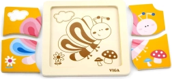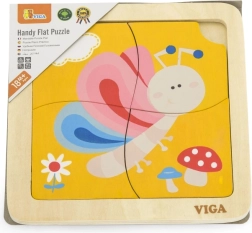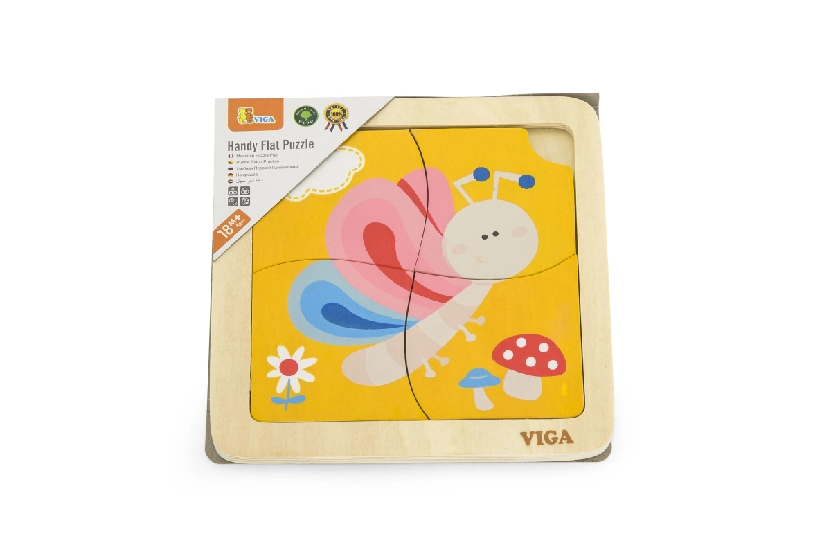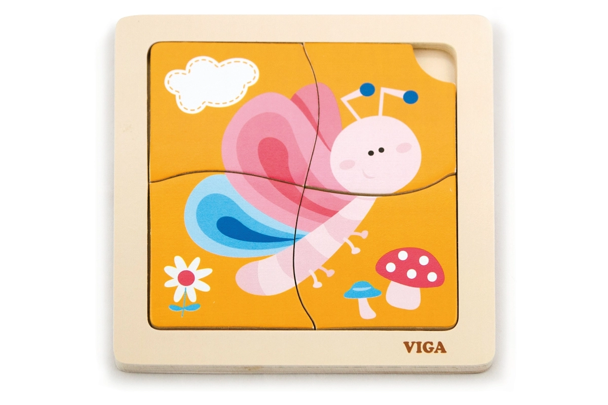 Този сладък дървен пъзел с цветна пеперуда е чудесен избор за първо запознаване с пъзели. Четирите стабилни части се държат лесно в детските ръчички и се подреждат в здрав дървен поднос с шаблон. Една част има практичен отвор за лесно изваждане, така че децата бързо се научават да манипулират частите и да ги подреждат отново.