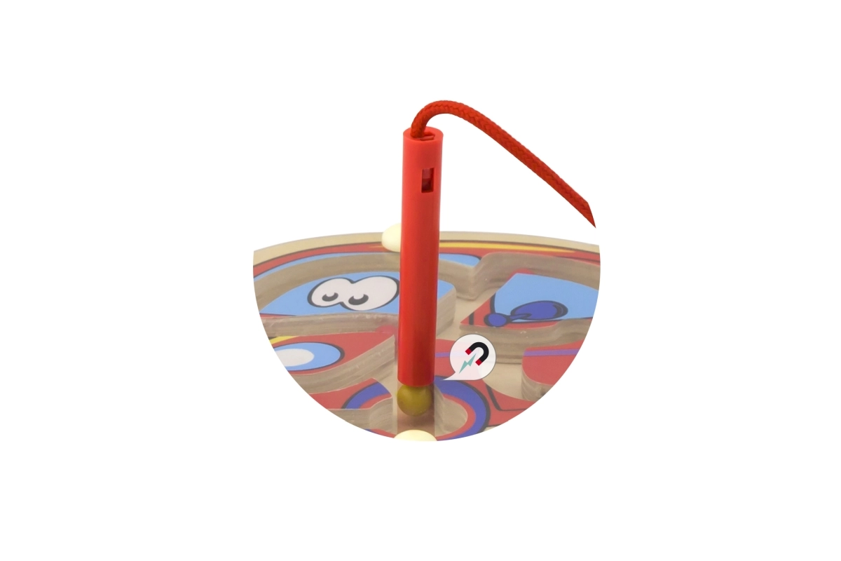 Благодарение на магнитната пръчица, закрепена на връв, работата с лабиринта е лесна и не се рискува загуба на важни части.