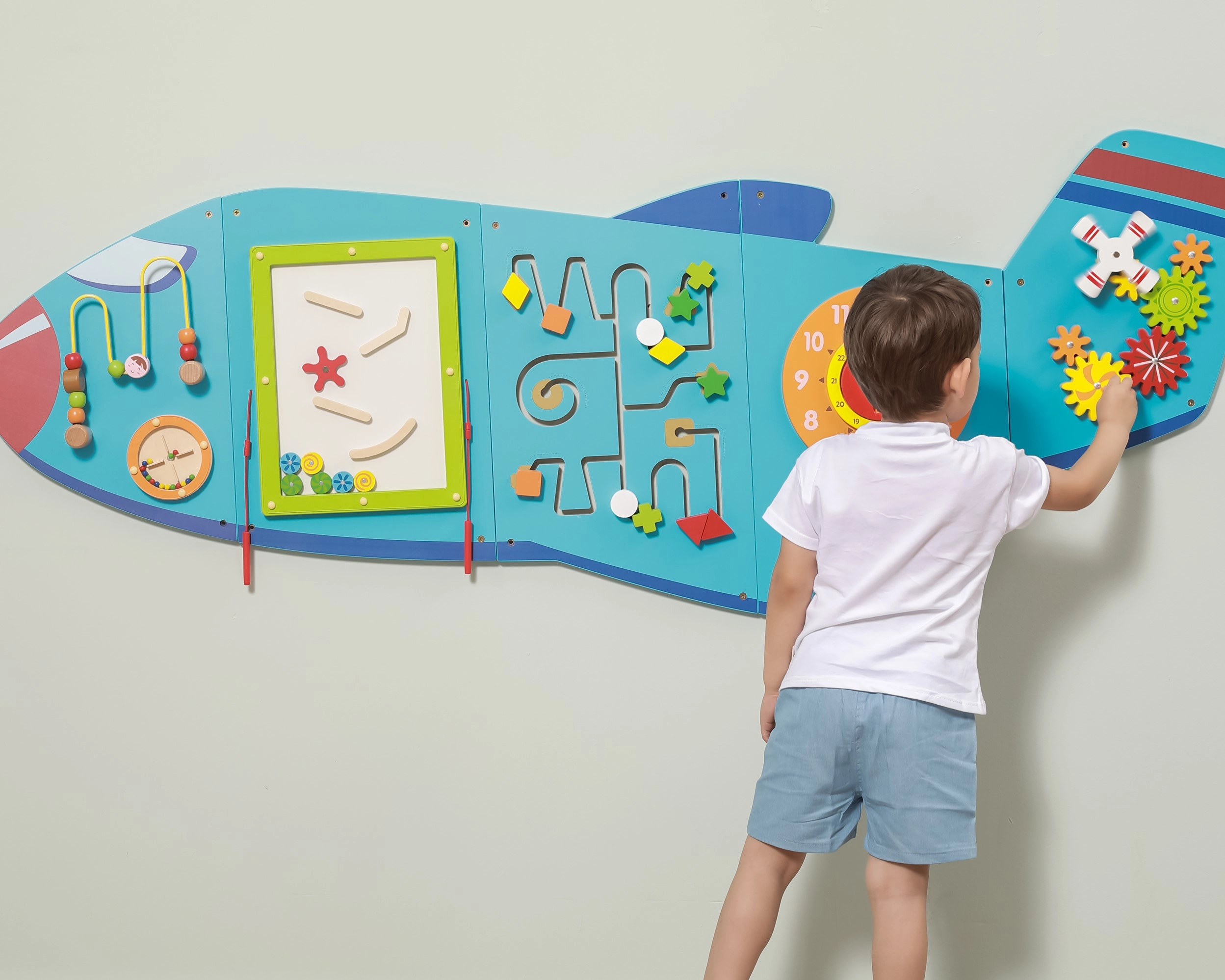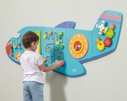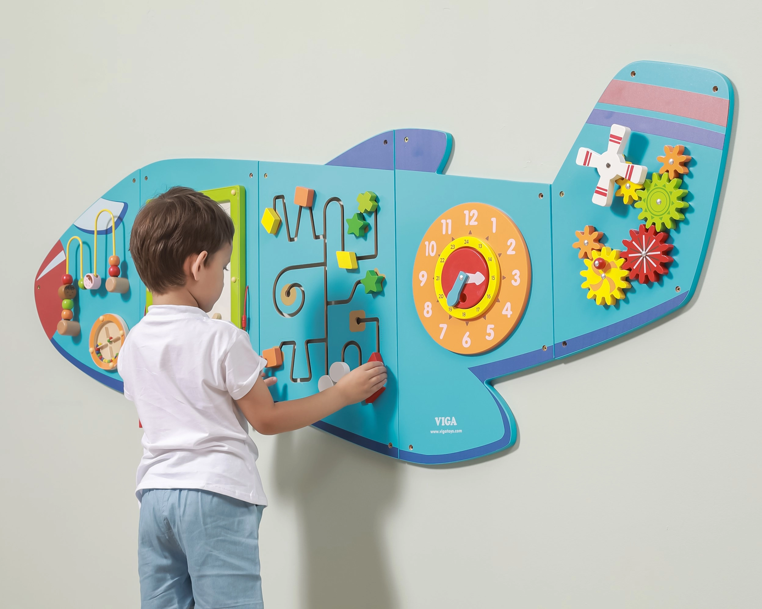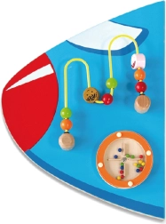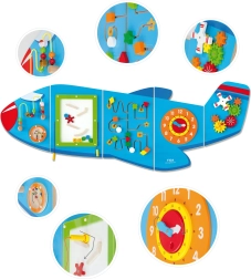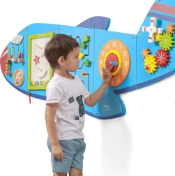Дървената стенна дъска Самолет на VIGA е многофункционална играчка, състояща се от пет части, които заедно оформят силует на самолет. Всеки елемент предлага различен тип активности за забавно развитие на детските умения: