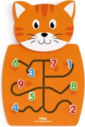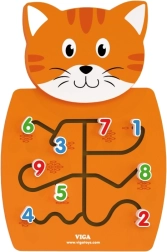 Дървена котка с лабиринти за преместване на числа и развитие на фината моторика.