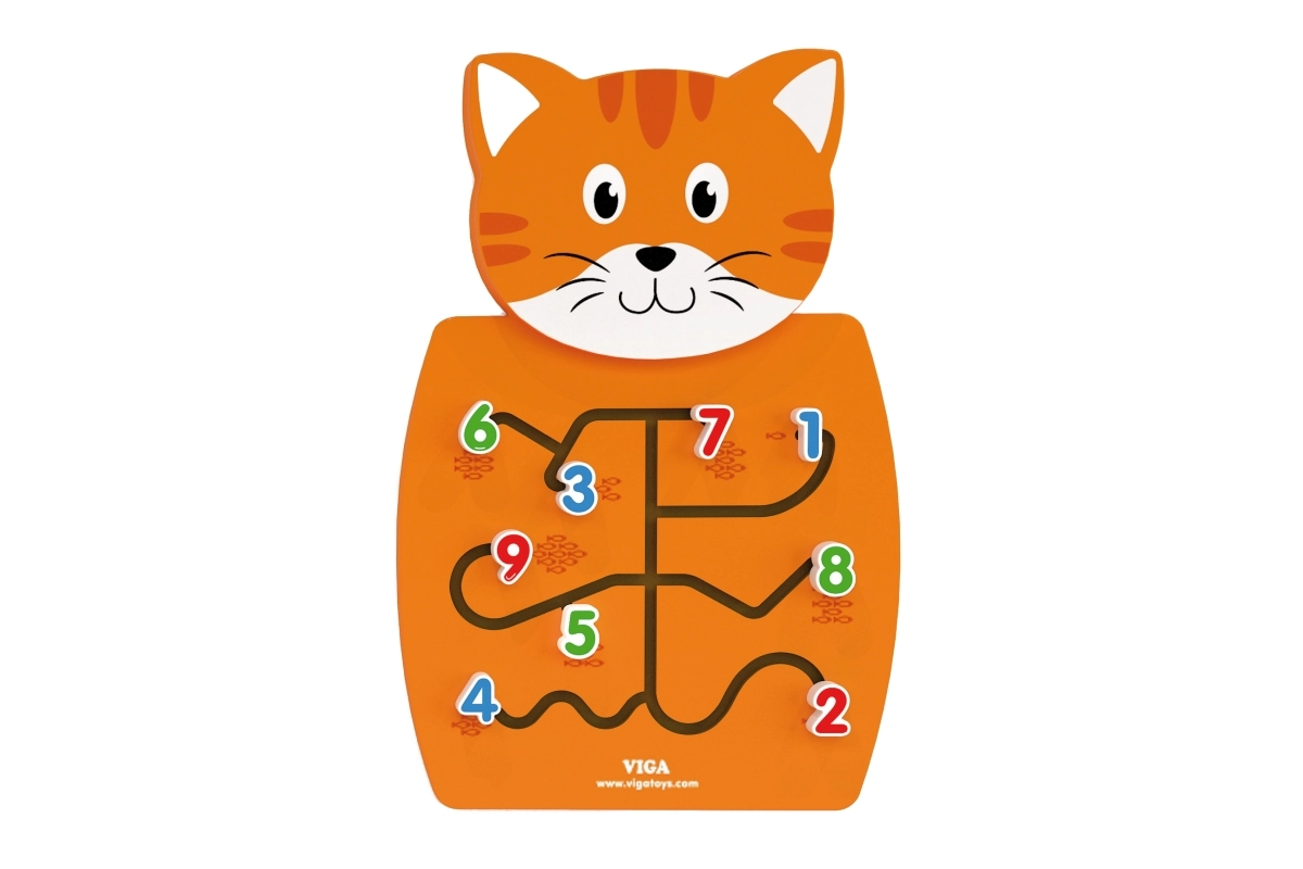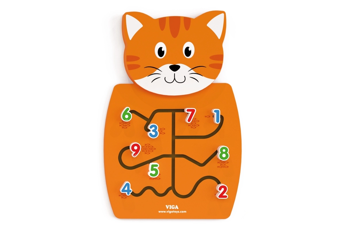 Тази интерактивна играчка във форма на котка съдържа различно изрязани лабиринти на коремчето, където децата трябва да местят блокчета с числа и да ги съотнасят към съответния брой изобразени рибки. Така децата усвояват основите на математиката и логическото мислене. В съответствие с принципите на Монтесори играчката насърчава децата самостоятелно да решават проблеми чрез игра.