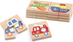 Този пъзел помага на децата да развиват логическото си мислене чрез комбиниране на цветни картинки в завършени превозни средства.