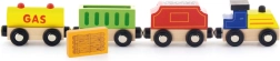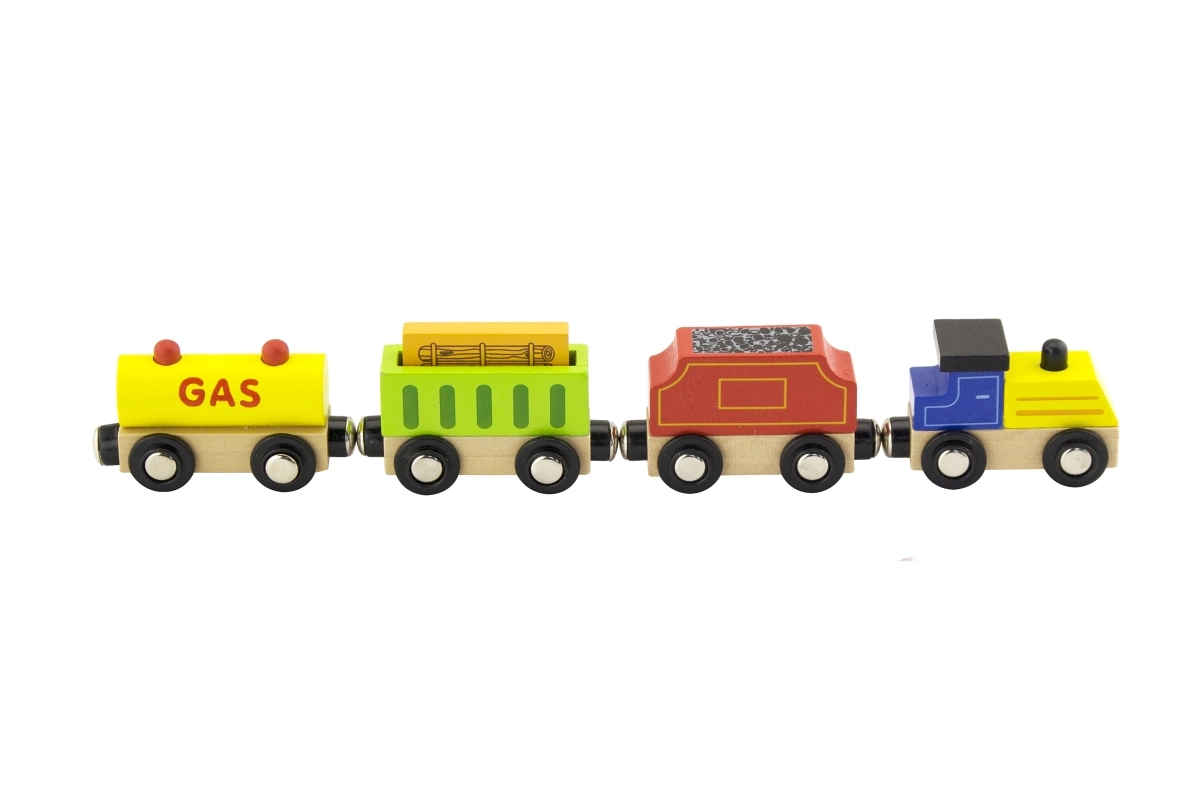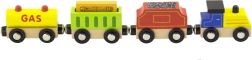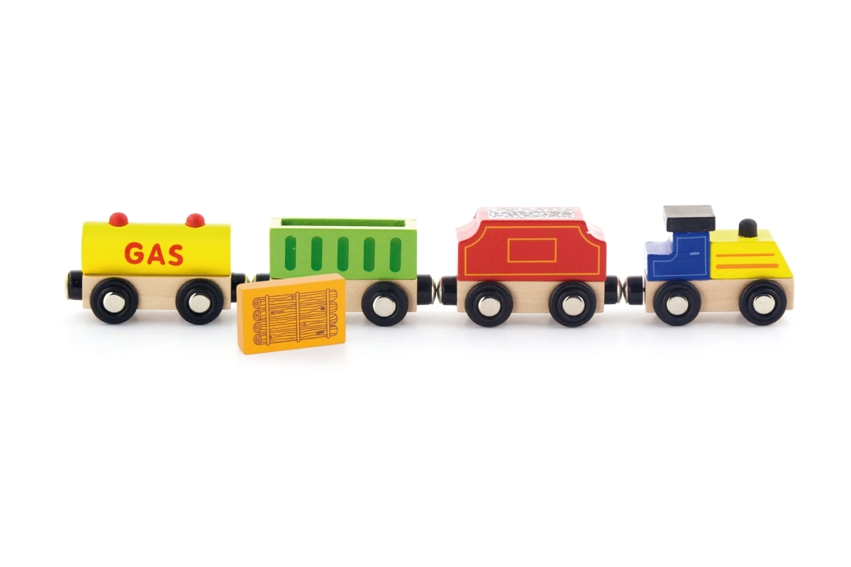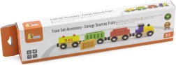 Пъстро дървено влакче с локомотив и 3 вагона на тема енергийни източници ще зарадва малките машинисти. Вагоните се свързват лесно благодарение на магнитни куплунги, съвместими са с повечето дървени влакови релсови системи и подпомагат развитието на въображението и фината моторика. Размер на един вагон приблизително 7 × 4,5 × 2,5 cm, подходящо от 3 години.
